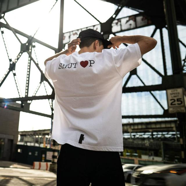 CHARI&CO のスローガンの一つでもある 『SHUT UP』。自分の弱い気持ちに対して黙れ!自分を超えろ!の意味。ニューヨークでお馴染みのロゴのフォントと、ハートをオマージュして可愛く仕上げた。こ着丈を少し短くすることで、16年前のブランドスタート時からあったストリート感ある野暮ったさを一新し、現在のモダンさを優先。長期的な着用を想定して開発したオリジナルカスタムボディ。16/-のオー.プンエンド糸を使用しているため、ドライでガシッとした着心地の良い、アメリカンコットンライクに仕上がっている。