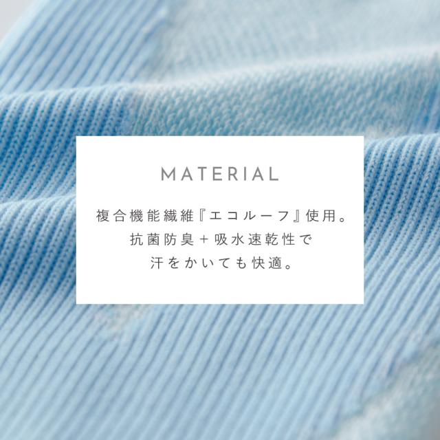 抗菌防臭・ドライタッチの複合機能繊維『エコルーフ』を使用。吸水速乾性をもたせることでWのパワーで汗をかいても快適。