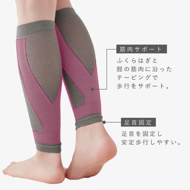 ふくらはぎ、脛の筋肉に沿ったテーピング編みで筋肉をサポート。足首を固定し安定歩行しやすくなります。