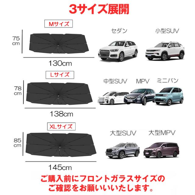 使わないときは収納してスペースを取らずに収納できます。いろんなサイズがありますので、ご購入の前に愛車のフロントガラスのサイズをご確認ください
