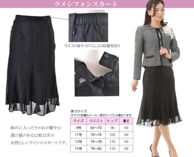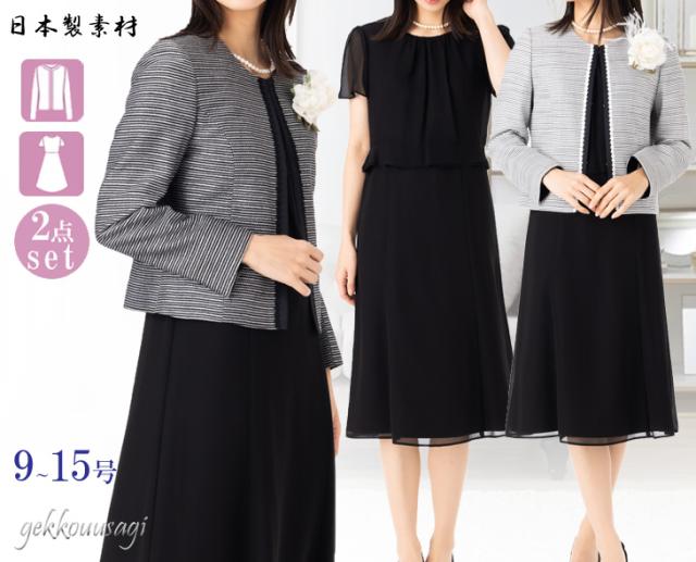 9号、11号、13号、15号サイズのジャケットとワンピースの2点セットスーツです。