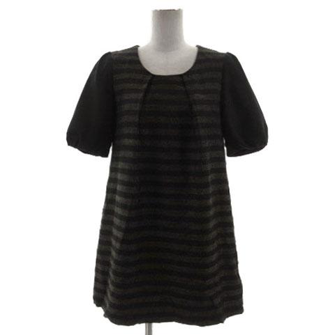 【中古】レイビームス Ray Beams ワンピース タック 袖切替え 半袖 ひざ丈 日本製 起毛 ボーダー 黒 ラメ ゴールド