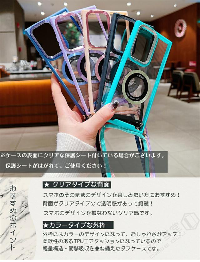 人気の秘密は、クリアな背面と、外枠のカラーを組み合わせたショルダー付きのスマホケースです。