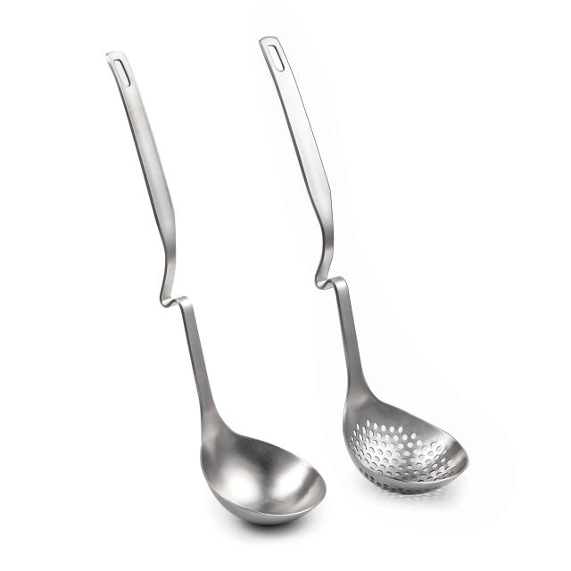 1.鍋物の必需品で汁物にお玉、具だけの時は穴あきお玉と使い分けです。お鍋や容器のフチにかけられるフック付き、持ちやすく、質感があり、見た目は綺麗ですが、実用性も高いのお玉セットです。