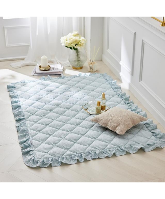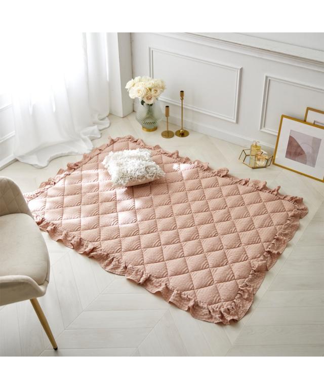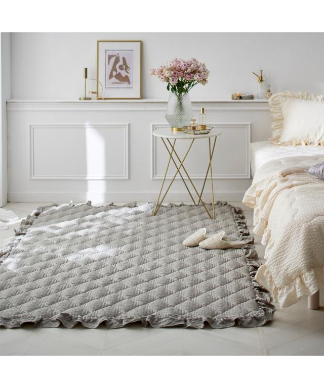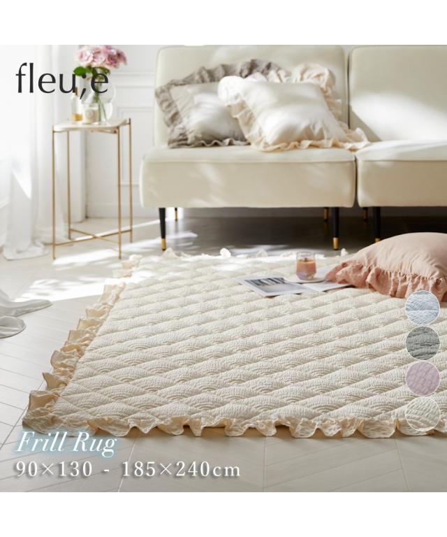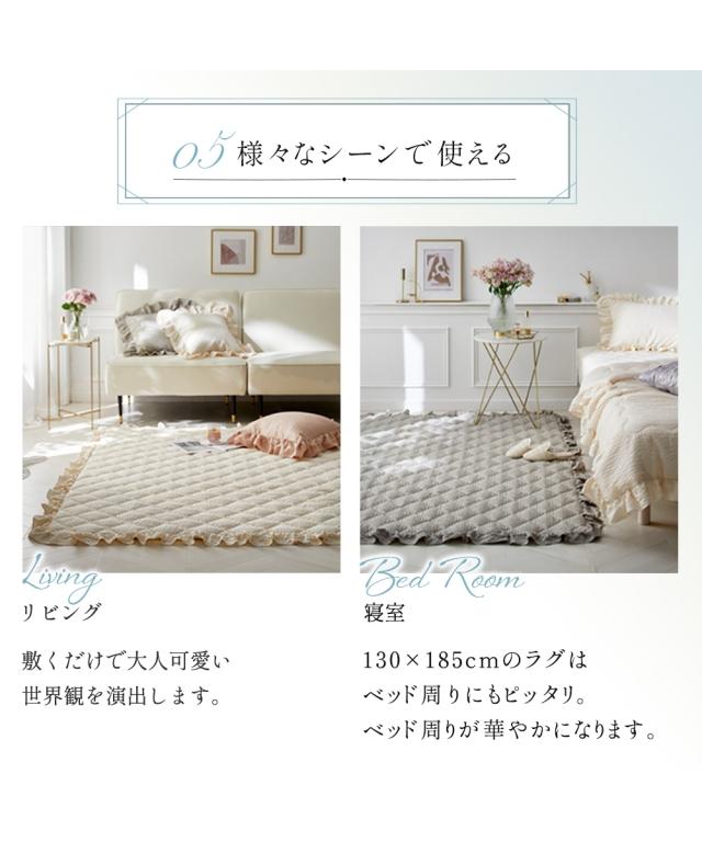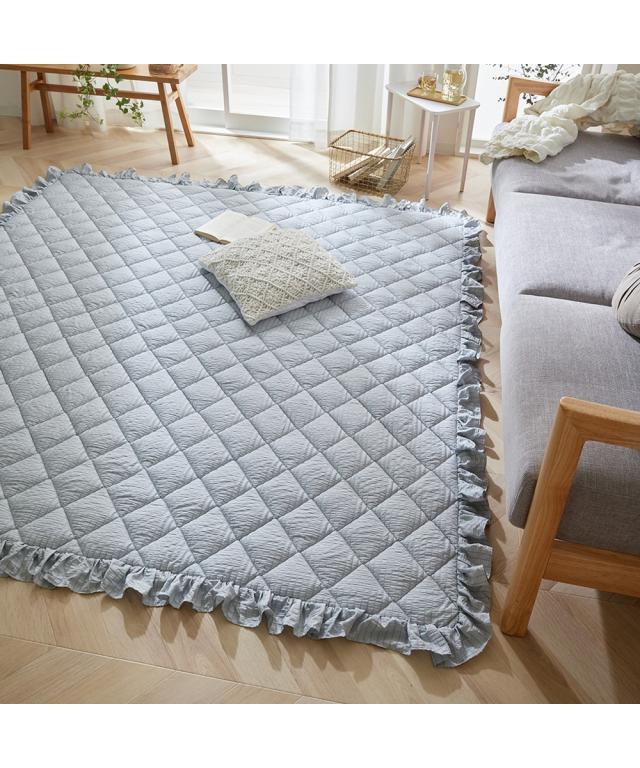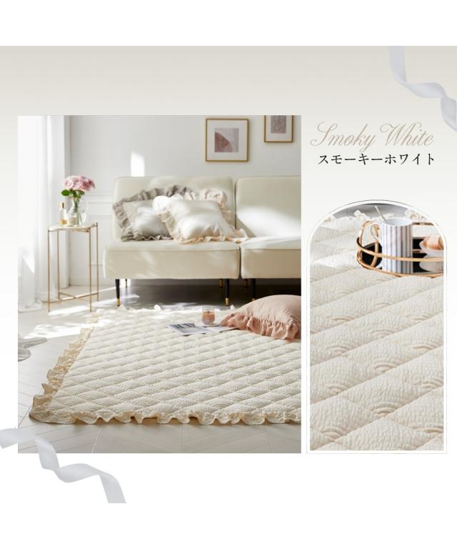 ふわっとしたやわらかさ&くしゅっとしたかわいらしい見た目!にキュンとしちゃうキルトラグ!四方をこだわりのフリルで囲い、大人かわいい空間を演出。表面の凹凸感が特徴的なサッカー織りで素足でもさらさらっと気持ちいい、大人かわいい4色で自分好みのスタイルに。サイズも90×130cm、130×185cm、185×185cm、185×240cm、185×280cmとセンターラグはもちろん、デスク下やベッド横でも活躍してくれる5サイズをご用意。
