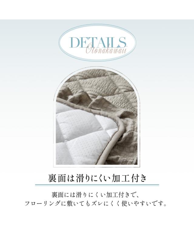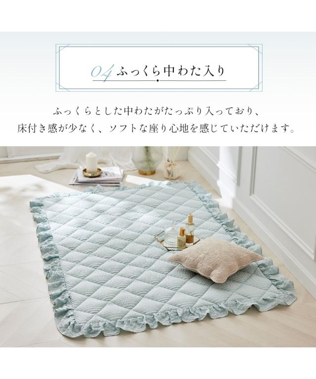 素材:表地=ポリエステル100%、中材=ポリエステル100%、裏地=ポリエステル100%(滑りにくい加工付) はっ水:なし 吸湿発熱:なし 接触冷感:なし 抗菌・防臭:なし 防ダニ:なし 防炎:なし 防音:なし 静電気防止:なし すべりにくい加工:あり ホットカーペット対応:〇 床暖房対応:〇 こたつ敷き対応:〇 梱包方法:折りたたみ ●スタッフコメント 肌ざわり:サッカー織りで素足でもさらさらっと気持ちいい! 厚み、クッション性:ふっくら中わた入りの中厚手タイプ コメント:こだわりのフリル仕様が魅力のキルトラグです。お部屋を大人かわいい空間にしてみませんか? 原産国:中国製 備考:洗濯機OK ネット使用