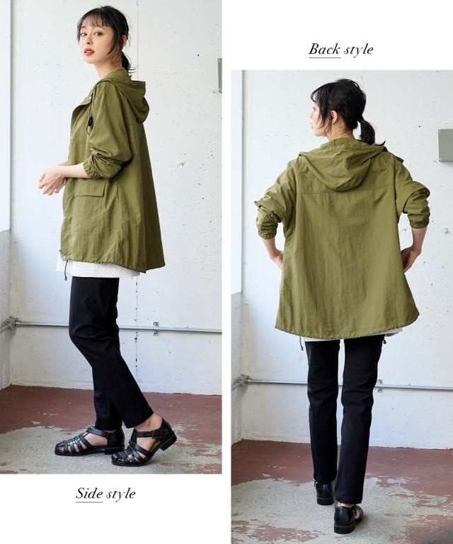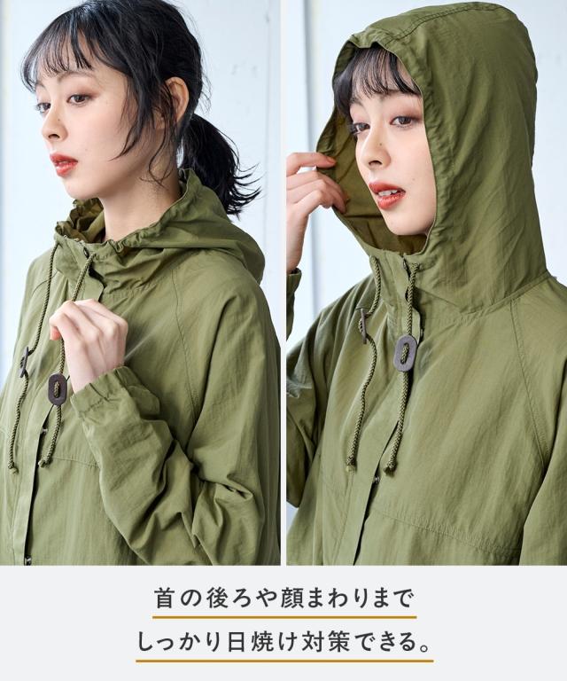 ゆったりしたサイズ設計になっているのでどんなアイテムと着てもラクチンです。裾にドロストが入っているのでシルエットが調整できて便利。後ろが長くなっているので気になり腰回りをしっかりカバーしてくれます。首のひもを絞れば気になる首の日焼けもカバーしてくれます。