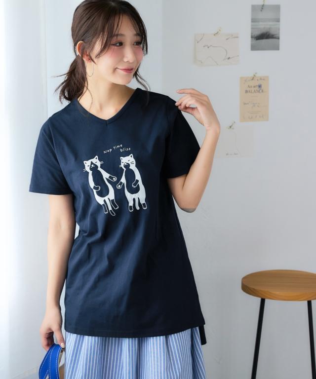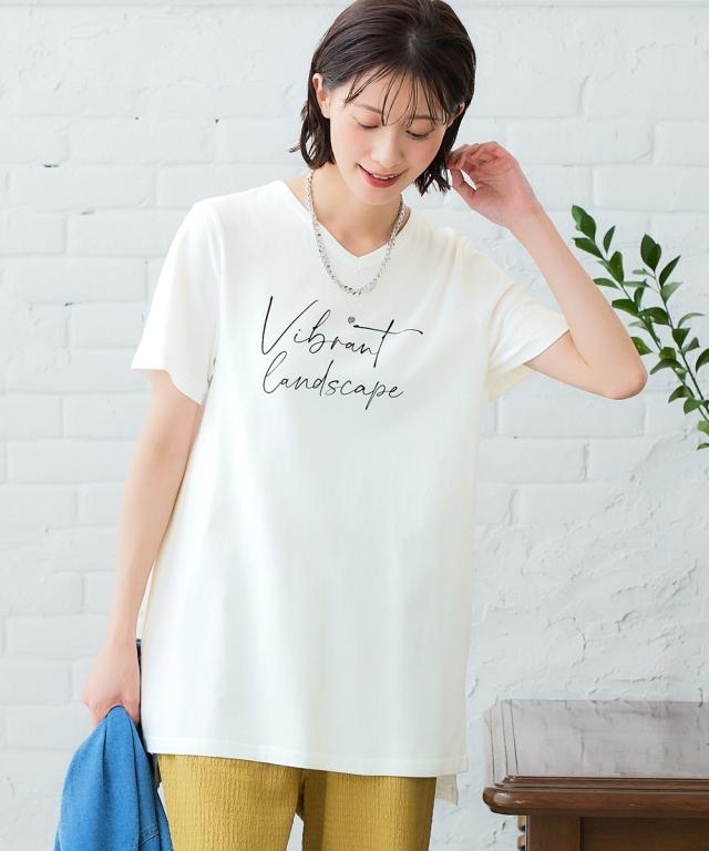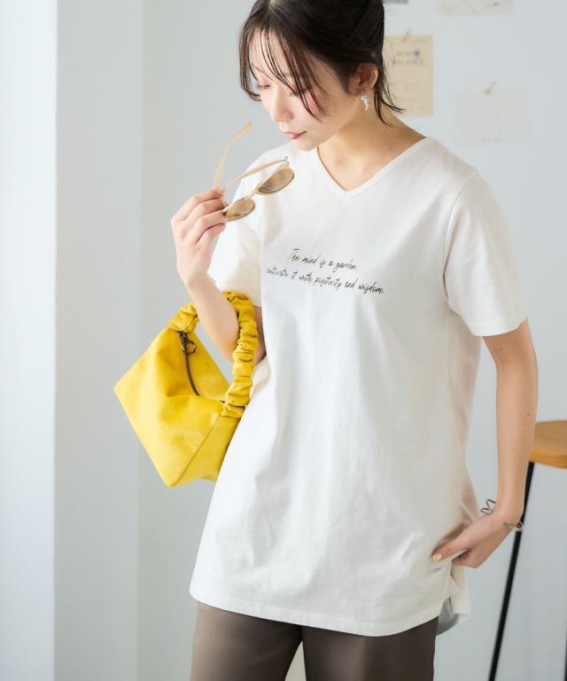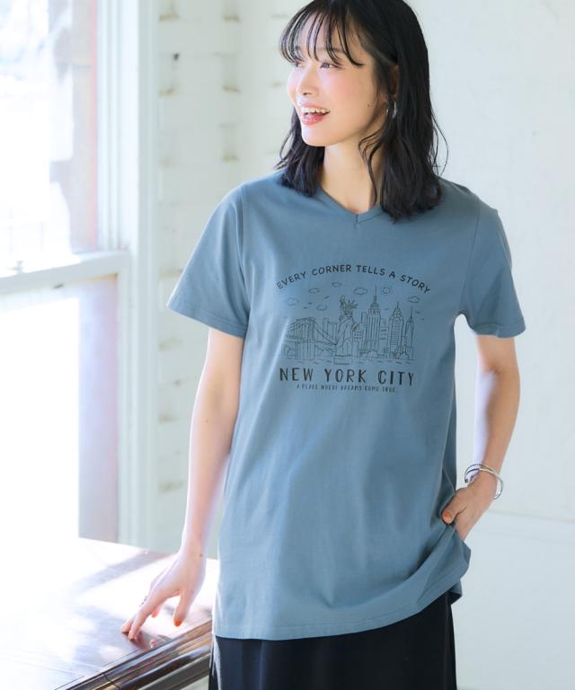 深めのVネックは顔周りをすっきりとした印象にするプリントTシャツ