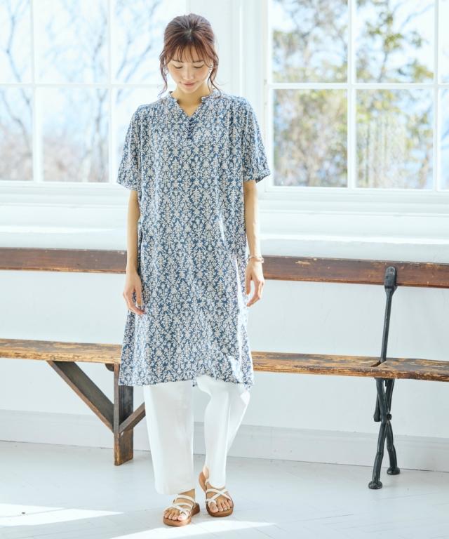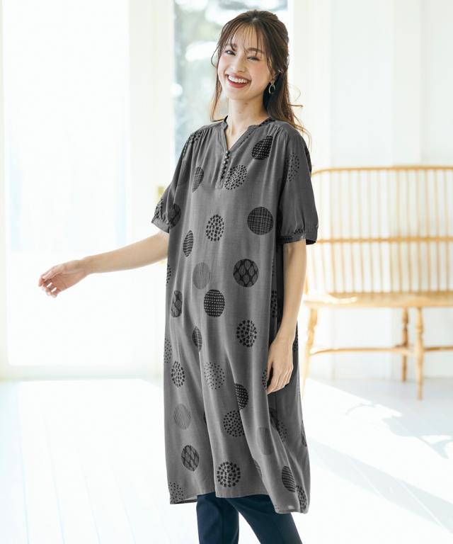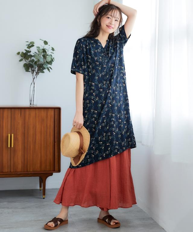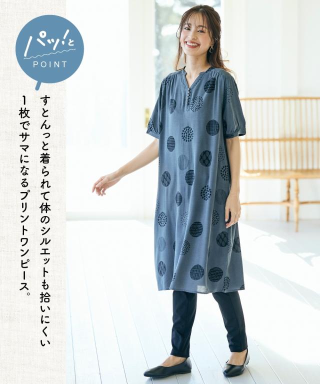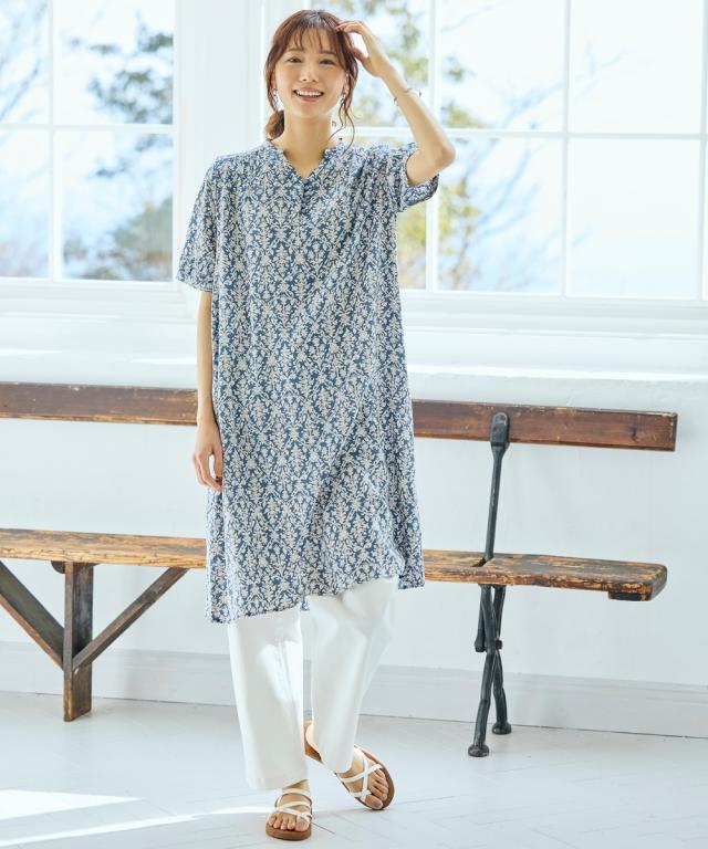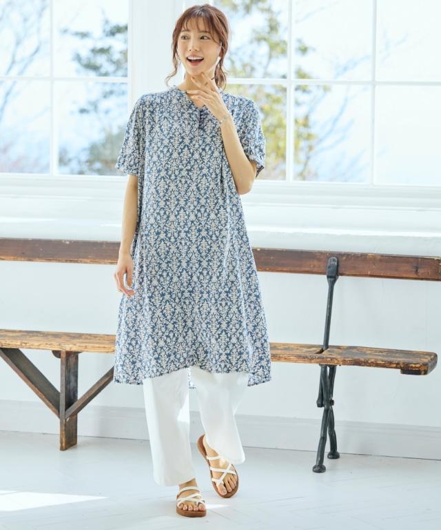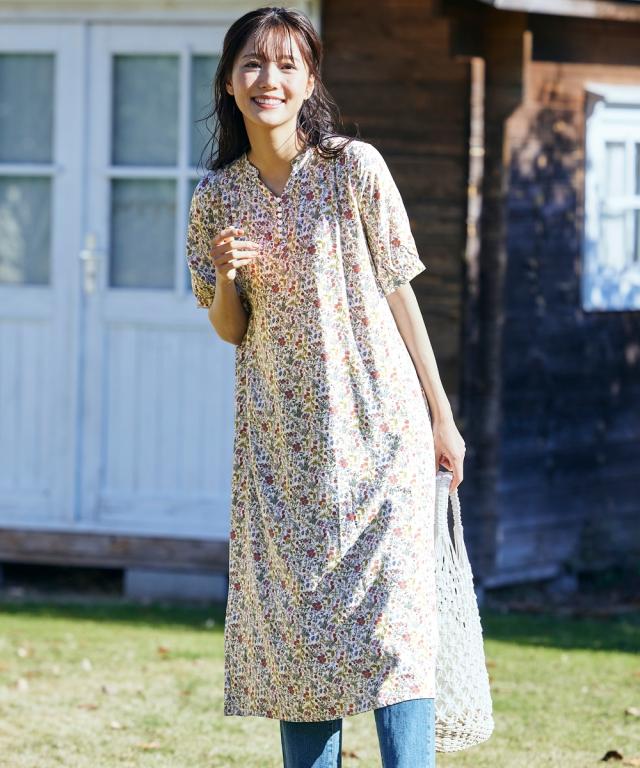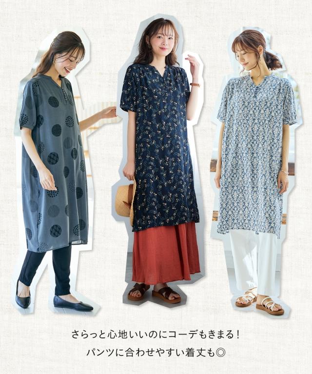 Vネックと縦に並んだボタンがゆったり楽なのにスッキリ見せてくれます。ひざ下まであるので気になるところが隠れて安心です。様々な柄があるのでそろえたくなりますね。