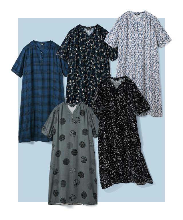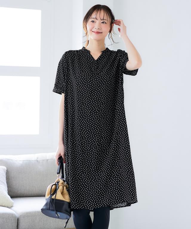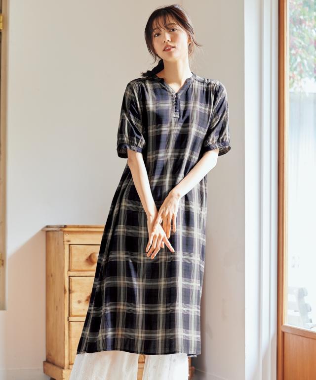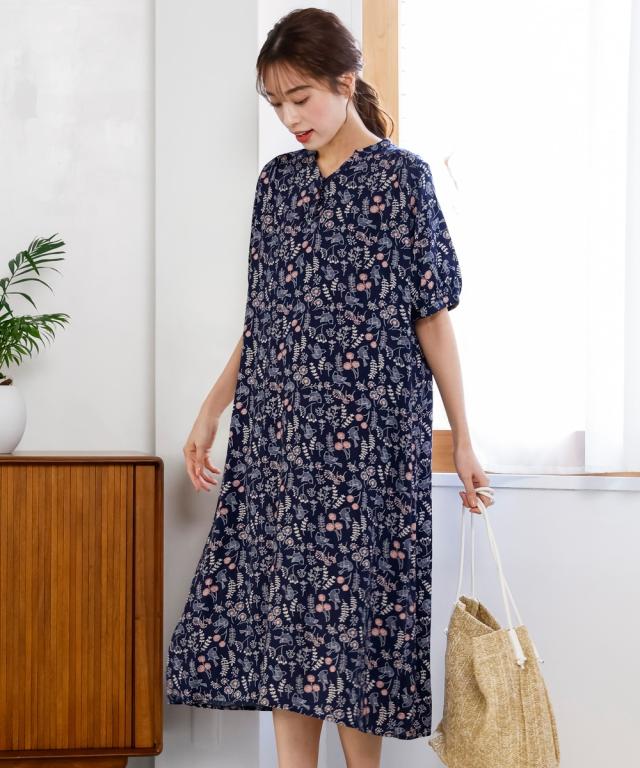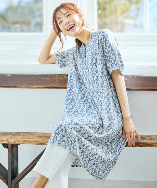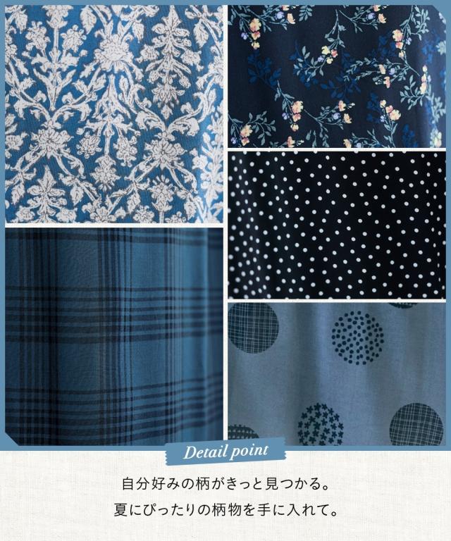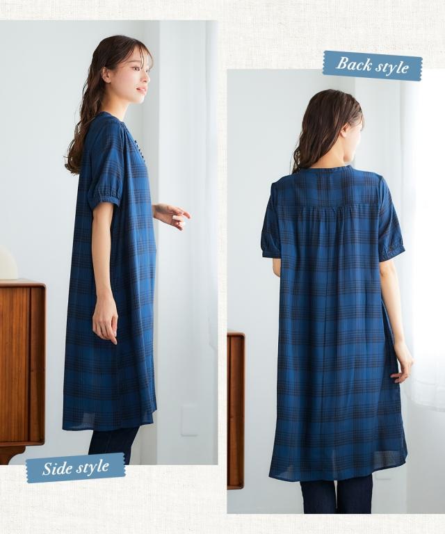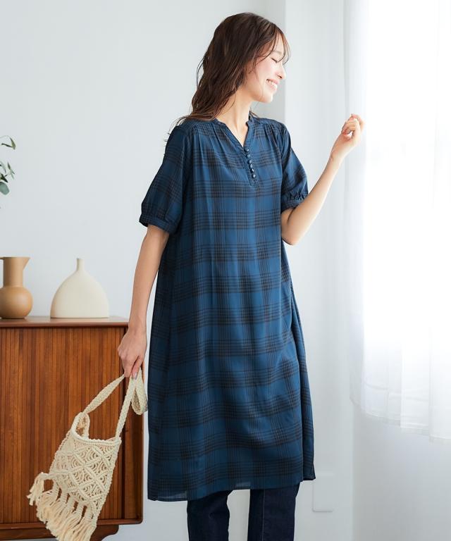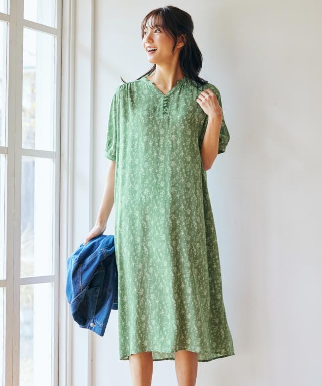 Vネックと縦に並んだボタンがゆったり楽なのにスッキリ見せてくれます。ひざ下まであるので気になるところが隠れて安心です。様々な柄があるのでそろえたくなりますね。