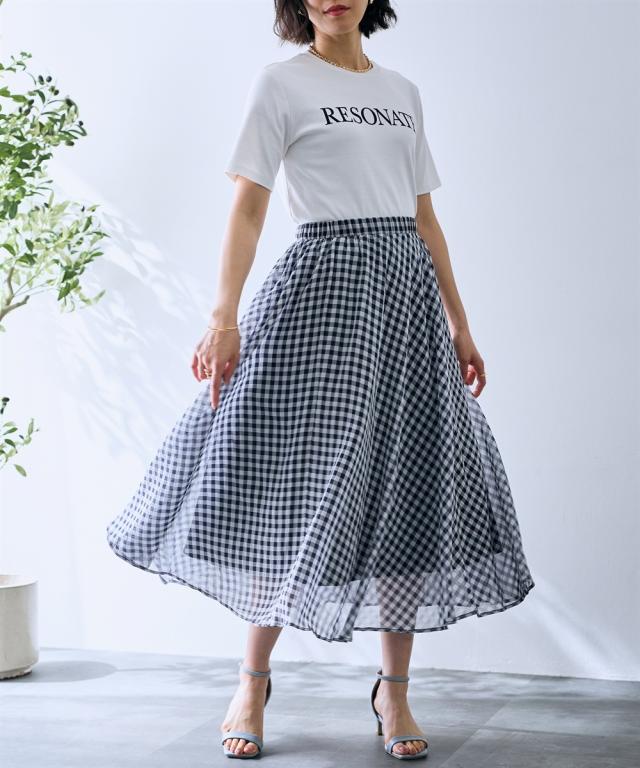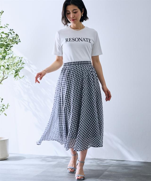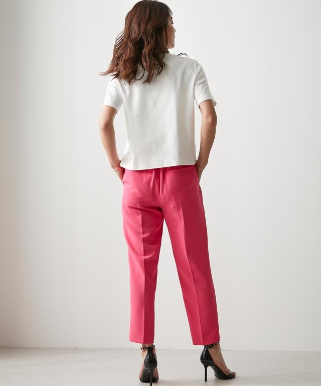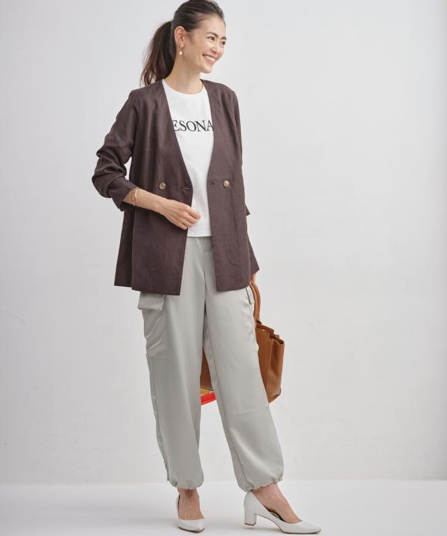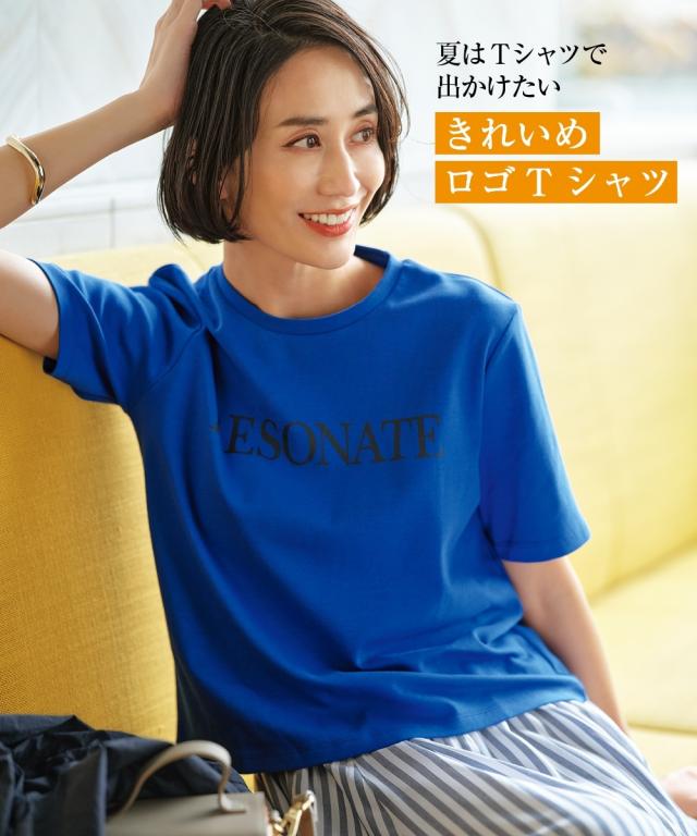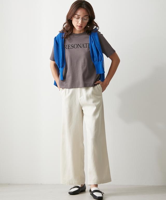 少し厚みのある素材とダボっとしないシルエットできれいめの印象に。開きすぎない衿ぐりや、少し長めの半袖丈がオトナ世代に嬉しい。