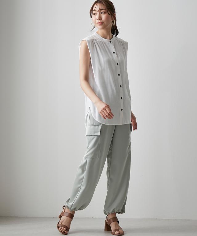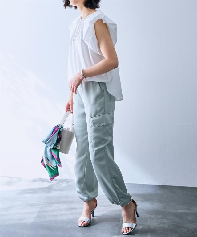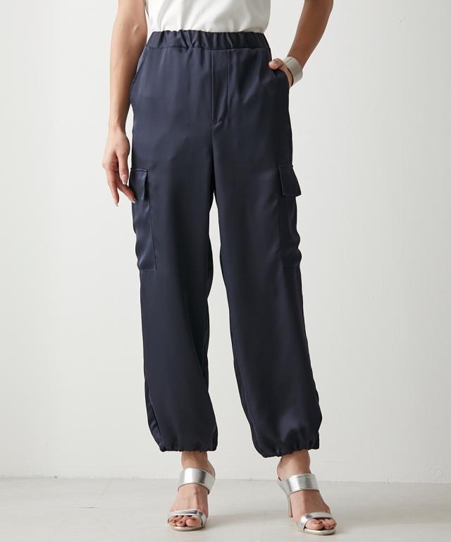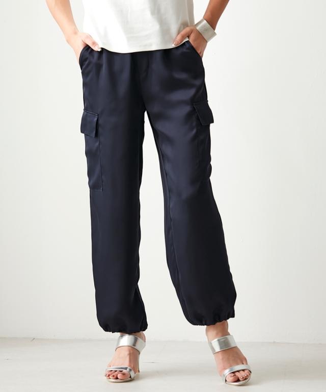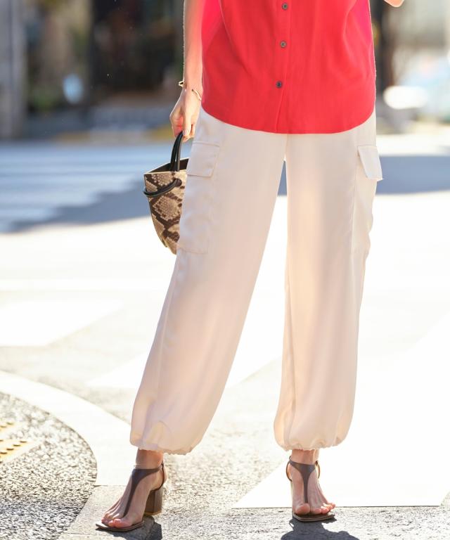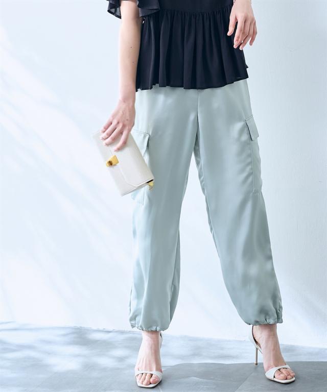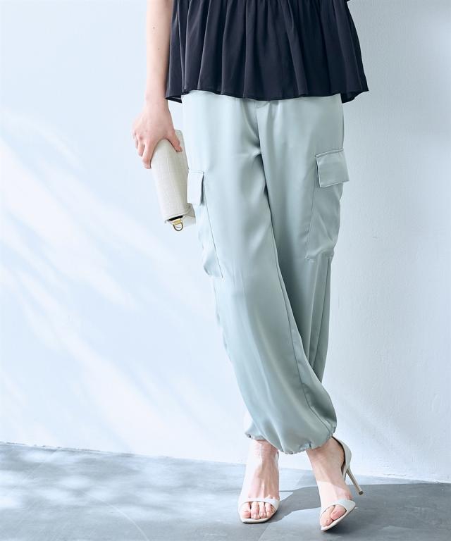 軽くて涼しいサテンパラシュートパンツ。ルーズなシルエットでリラックス感のある穿き心地です。裾のゴムシャーリングはひもが外に見えにくい設計で更に足首をすっきりと見せ、美脚効果も抜群。カーゴパンツのディテールを取り入れたデザインで、機能性も兼ね備えています。
