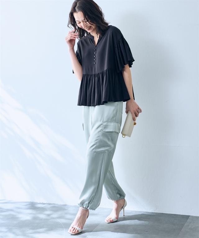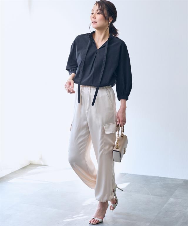 コーデに投入するだけでトレンド感を発揮するパラシュートパンツ。ほどよいボリュームと上品なつや感で、きれいめに仕上げました。
