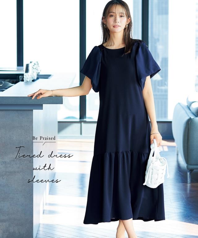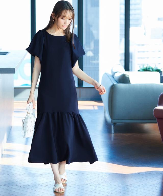 裾に向かってフレアに広がるマーメイドシルエットとティアードデザインが、上品で女性らしい印象。