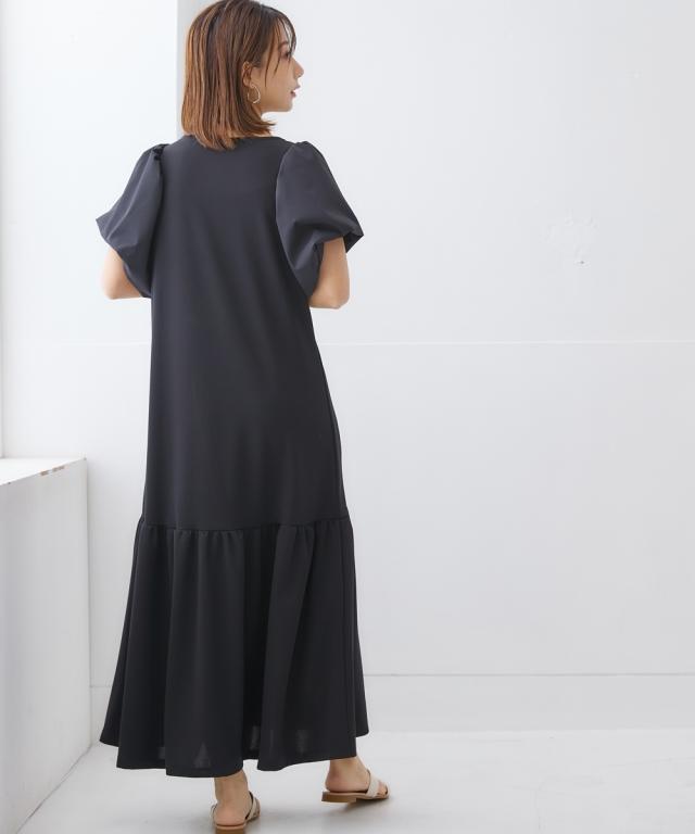 異素材で切り替えたボリュームスリーブが目を惹くマーメイドラインのワンピース