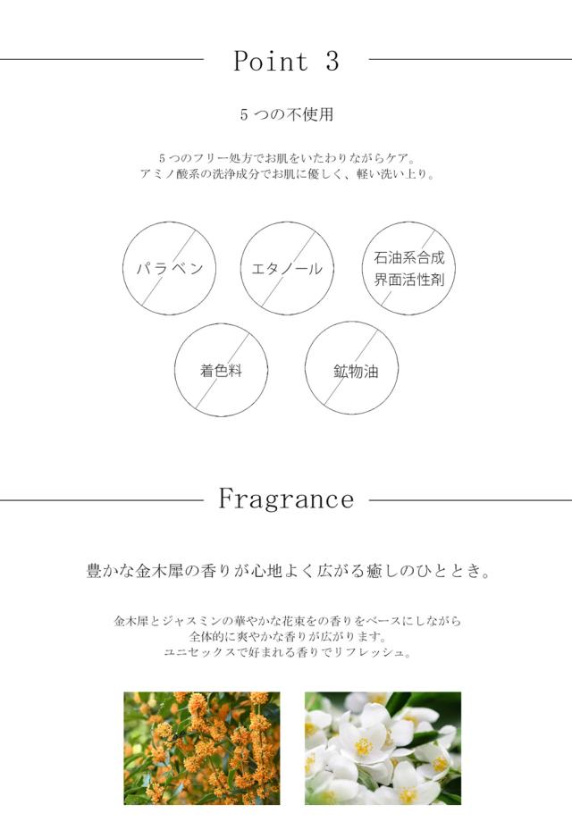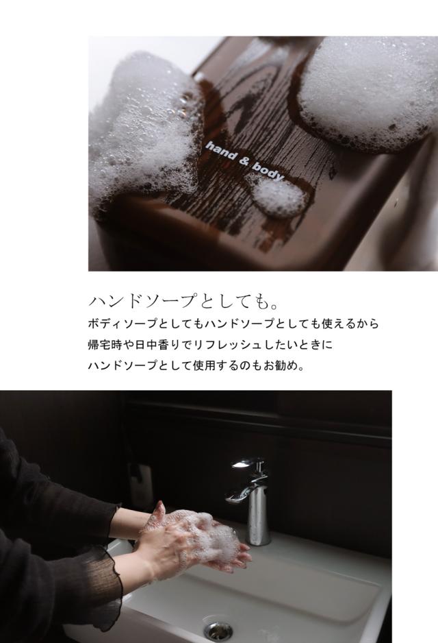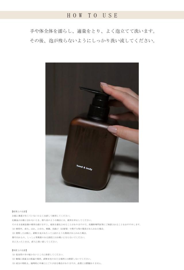 | ご使用方法 | 手や体全体を濡らし、適量をとり、よく泡立てて洗います。その後、泡が残らないようにしっかり洗い流してください。 |
