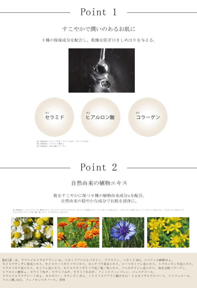 | 成分 | 水、ラウロイルメチルアラニンNa、コカミドプロピルベタイン、グリセリン、コカミドDEA、ココアンホ酢酸Na、セイヨウサンザシ果実エキス、セイヨウノコギリソウエキス、カニナバラ果実エキス、ローマカミツレ花エキス、トウキンセンカ花エキス、ヤグルマギク花エキス、カミツレ花エキス、セイヨウオトギリソウ花/葉/茎エキス、フユボダイジュ花エキス、加水分解コラーゲン、ヒアルロン酸Na、セラミドNP、セラミドAP、セラミドEOP、フィトスフィンゴシン、コレステロール、ラウロイルラクチレートNa、カルボマー、キサンタンガム、トリイソステアリン酸PEG−120メチルグルコース、トコフェロール、クエン酸、BG、フェノキシエタノール、香料 |