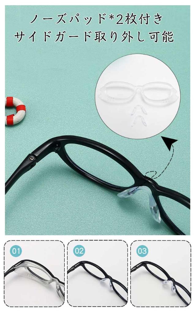 | 花粉メガネ 紫外線・ブルーライトカット機能 ノーズパッド*2枚付き サイドガード取り外し可能 サイドガードを利用することで花粉・ホコリ等の対策が可能です。 やわらかい素材なので目のまわりを傷つける事がなく、安心してお子様にかけていただけます! サイドガードを取り外し、ノーズパッドを付けることでブルーライトカットメガネや紫外線対策メガネ等として使用可能です。 イドガードは水洗いできて、いつでも清潔に! <details> ●鼻に接触する部分は、シリコン製で包まれており、快適な着用感。 ●重量は、たったの37g,柔軟性のあるフレームで、長時間身に着けやすいフレームです。 ●テンプル先端もシリコン製で耳が痛くならないように設計。 | |