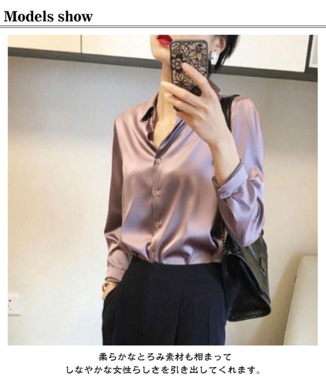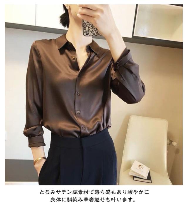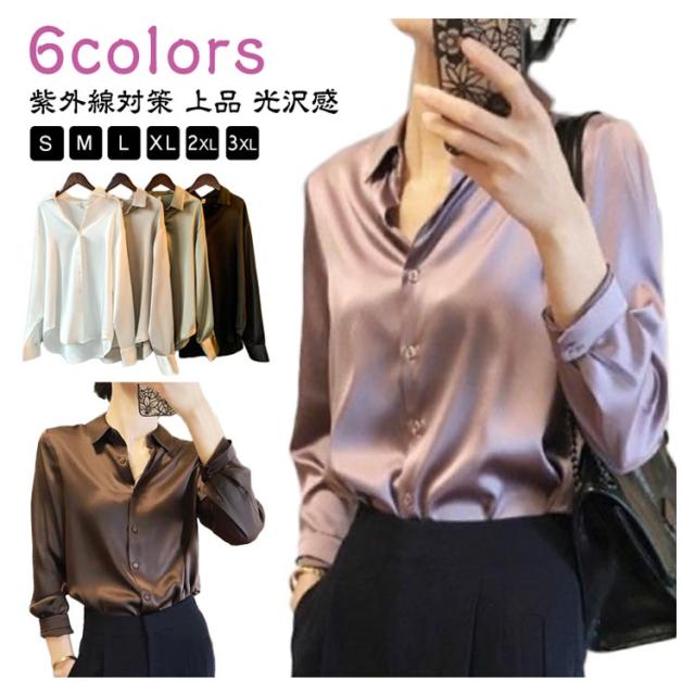 大きいサイズ 長袖 ブラウス シャツ レディース トップス オフィスカジュアル サテン とろみ素材 体形カバー とろみ 通勤 春秋 UVカット 紫外線対策 シャツ 光沢感 大人 上品 普段着 オフィス