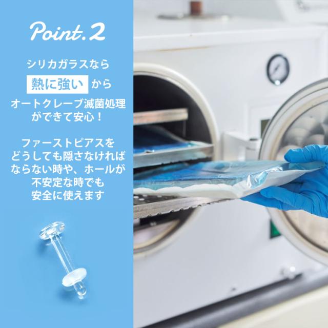 大切なホールを自然に隠すことが出来る人気のシークレットピアス。装着するとホールが見えにくくなり、隠したい場面でホールを維持したまま使用できる便利なボディピアスです。一時的にホールを目立たなくさせるのにおすすめのピアスです。 口ピアスや耳たぶ、軟骨ピアスとして幅広く使用できる最もスタンダードなタイプです。ラブレットを固定するクリアオーリング付き。シリカガラスは透明度が高いガラスです。熱や薬品にも耐性が強いため、滅菌処理やアルコール消毒を行っても劣化しません。表面が傷つきにくく、不安定なホールへの使用も安心です。