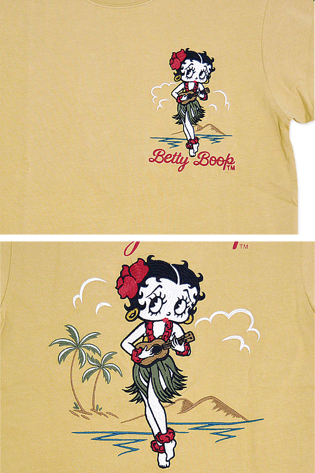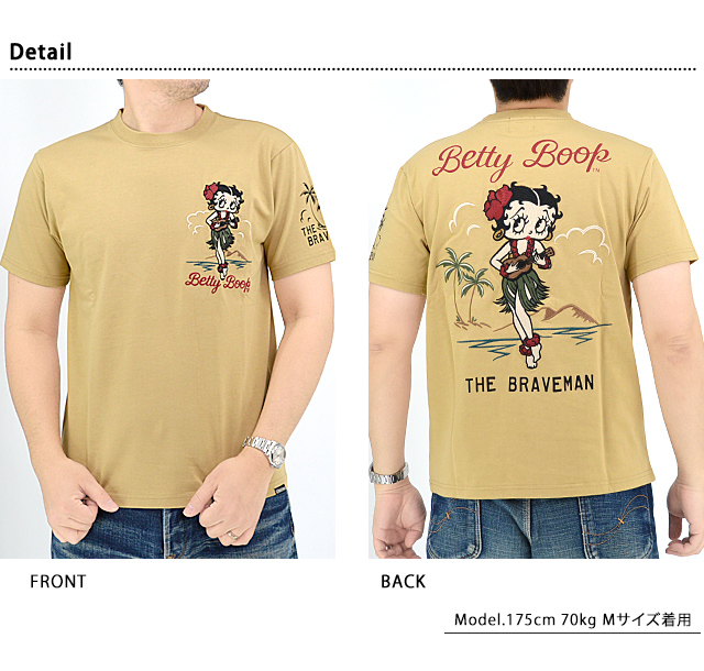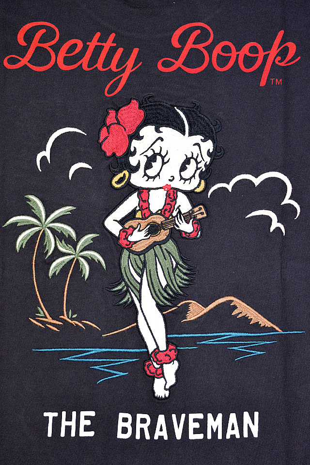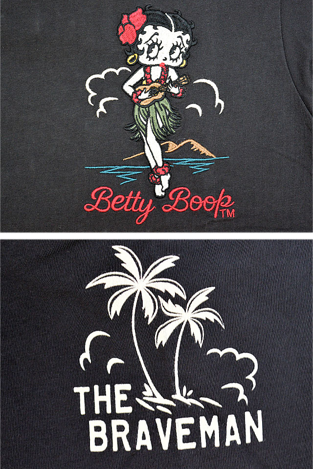 1920年代〜40年代にアメリカでワークウェアを中心とした製品を世に送り出したブランド「The BRAVE-MAN」から「BR×BETTYコラボ 天竺半袖Tシャツ(BBB-2415)」のご紹介です。 大きな瞳とぽってりした赤い唇が印象的な女の子、ベティ・ブープ(Betty Boop)。 背中にはフラガールに扮したベティが刺繍で描かれています。 背景にはヤシの木や海など南国のモチーフがデザインされており、夏にぴったりの仕上がりに。 フロント左胸にはフラガールのベティをワンポイントで刺繍しました。 左袖にはヤシの木とブランドロゴがプリントされています。 ボディーには、ややしっかりとした刺繍に負けない強さを持ったTシャツ生地を採用。 | |||||||||||||||||||||||||