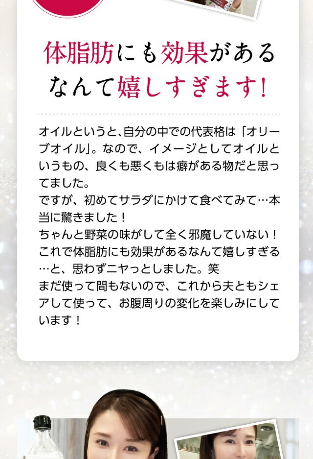 【摂取上の注意】◆油を直接飲むことはお控えください。◆一日の摂取量が多いと、お腹がゆるくなることがあります。