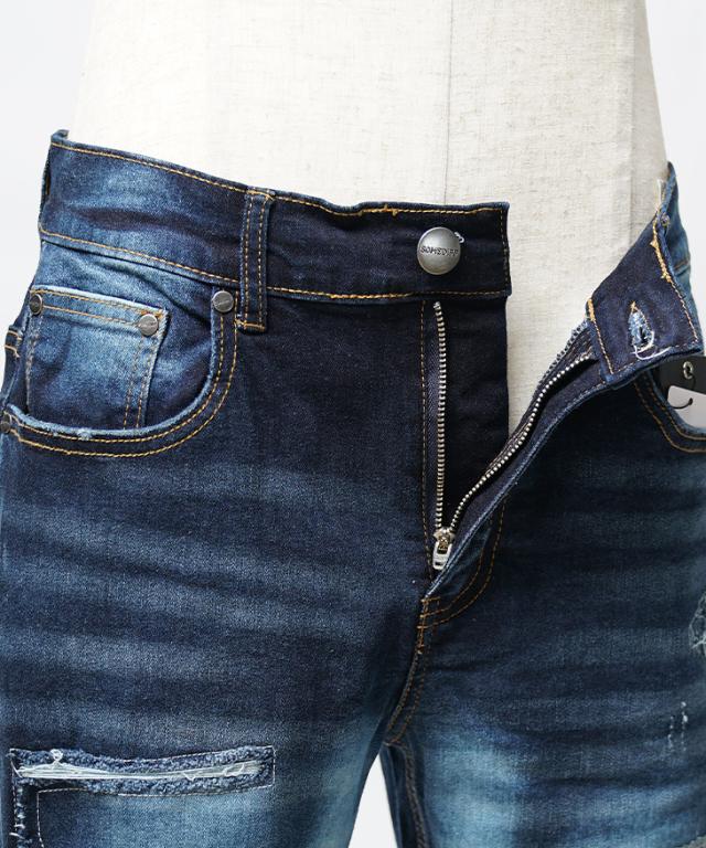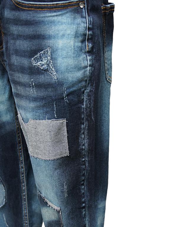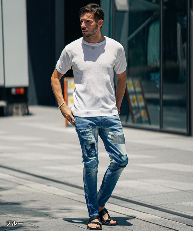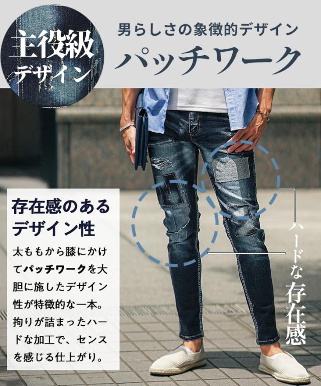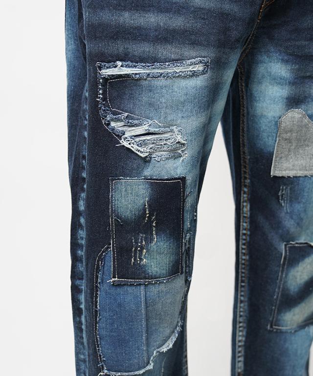 ダメージとパッチワークを施した立体的で動きのあるデザインデニムパンツ。