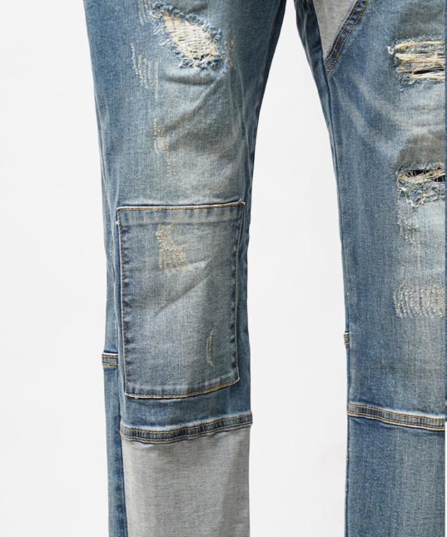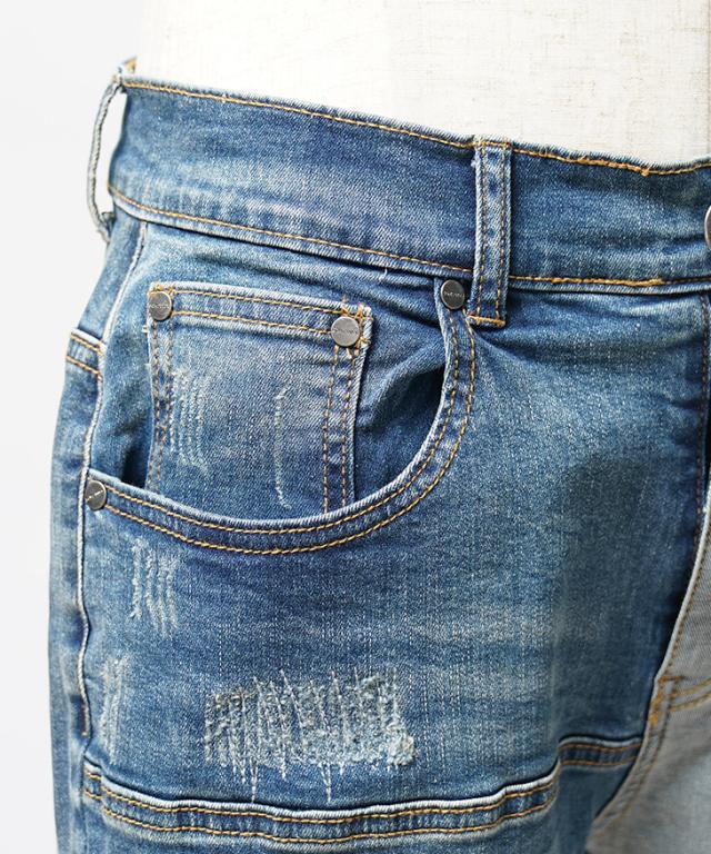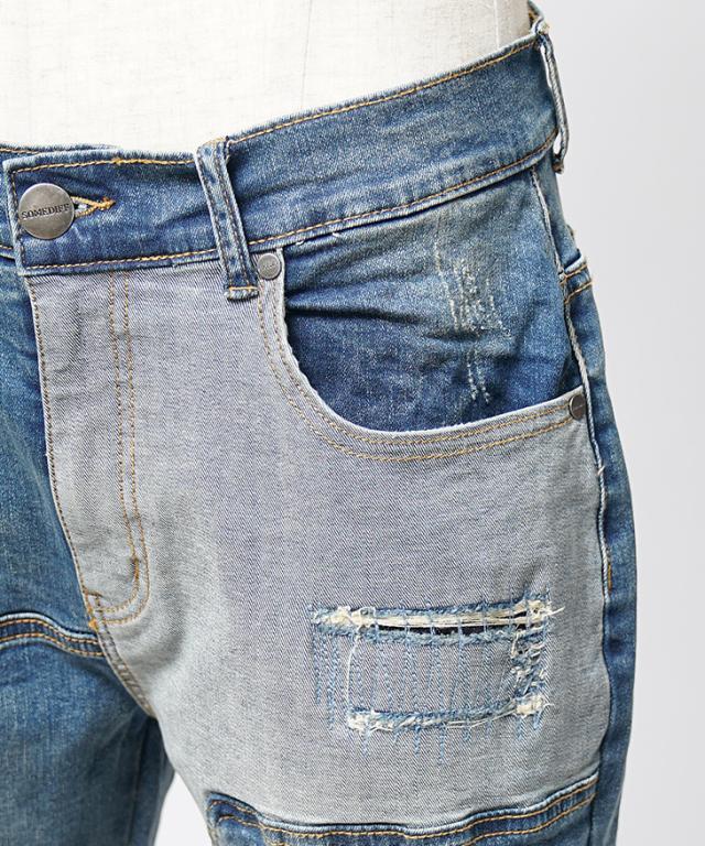 ダメージと切替デザインを施した存在感バツグンなデザインデニムパンツ。