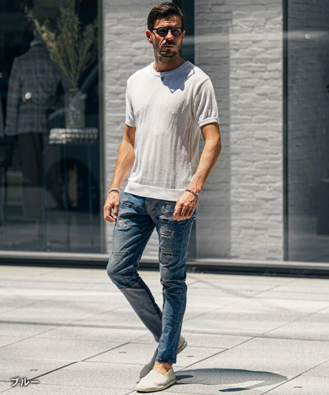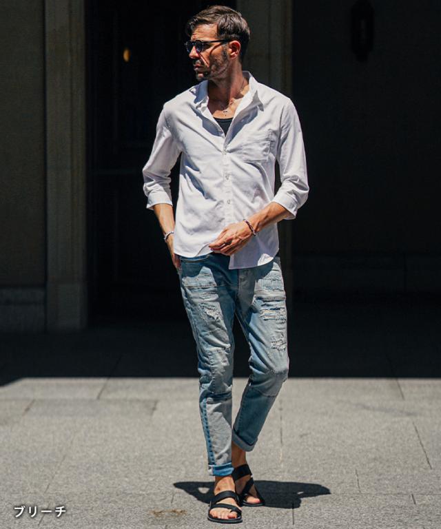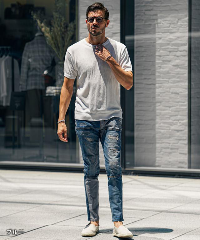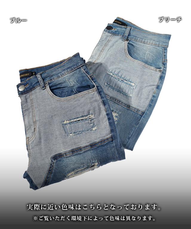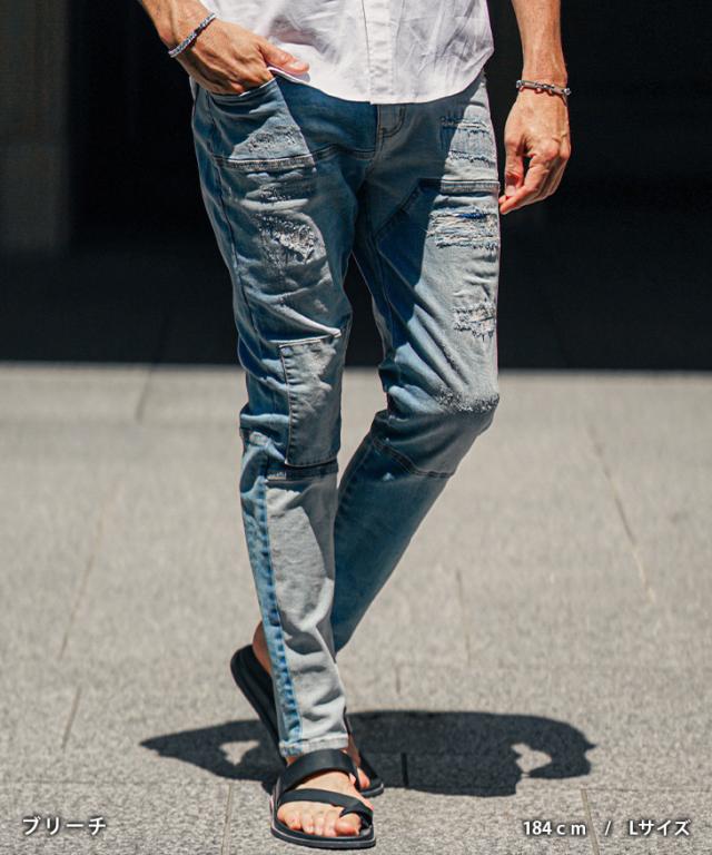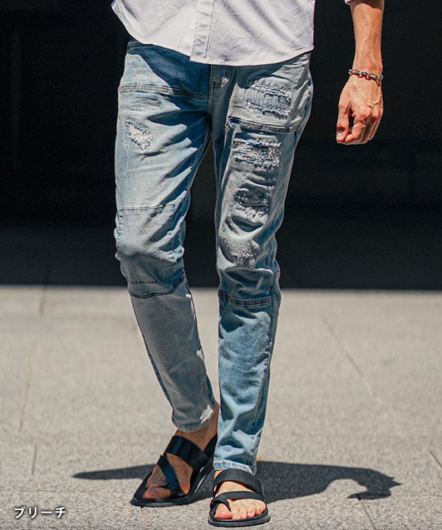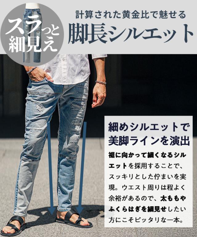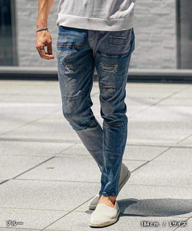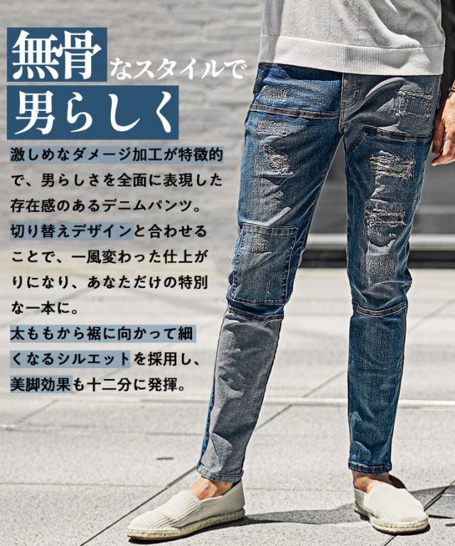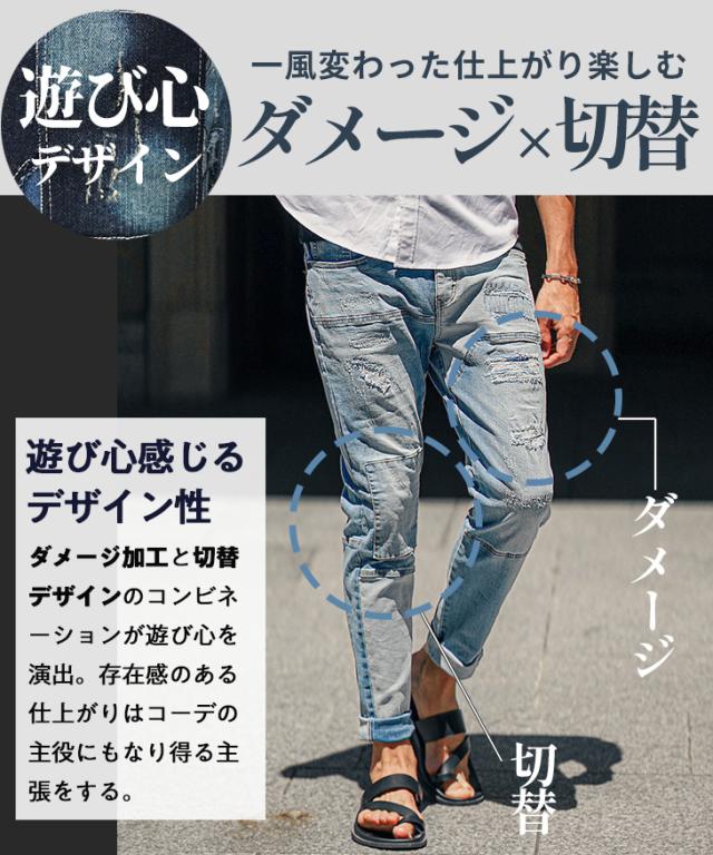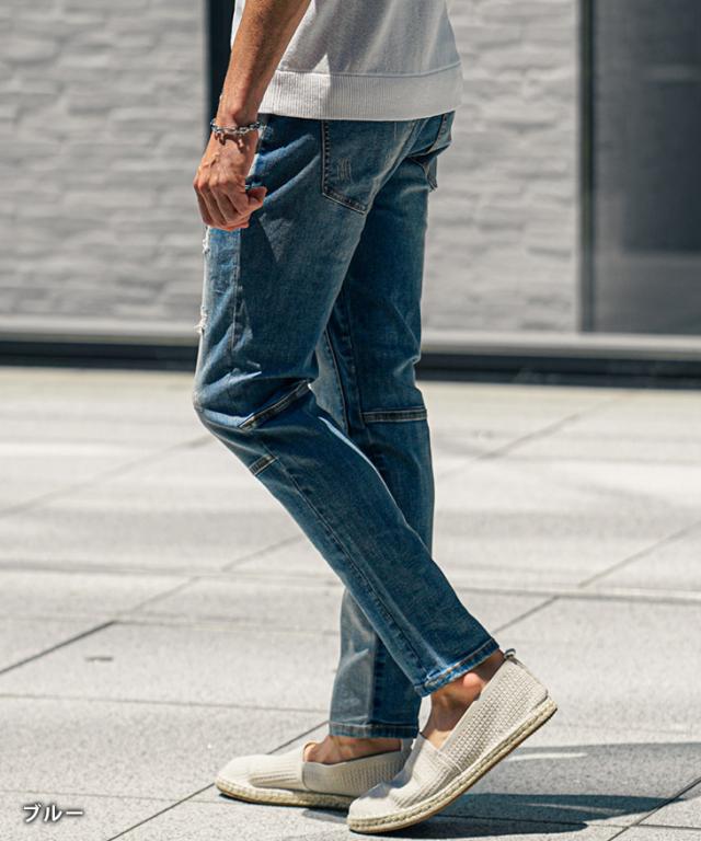 ジーパン メンズ テーパードデニム メンズ ダメージデニムパンツ メンズ スキニー デニム メンズ スキニーパンツ ダメージジーンズ 切替 ストレッチ パンツ タイト 細身 インディゴ 夏 夏服 夏物 春夏 メンズファッション ちょいワル お兄系 オラオラ系 夏新作 新作