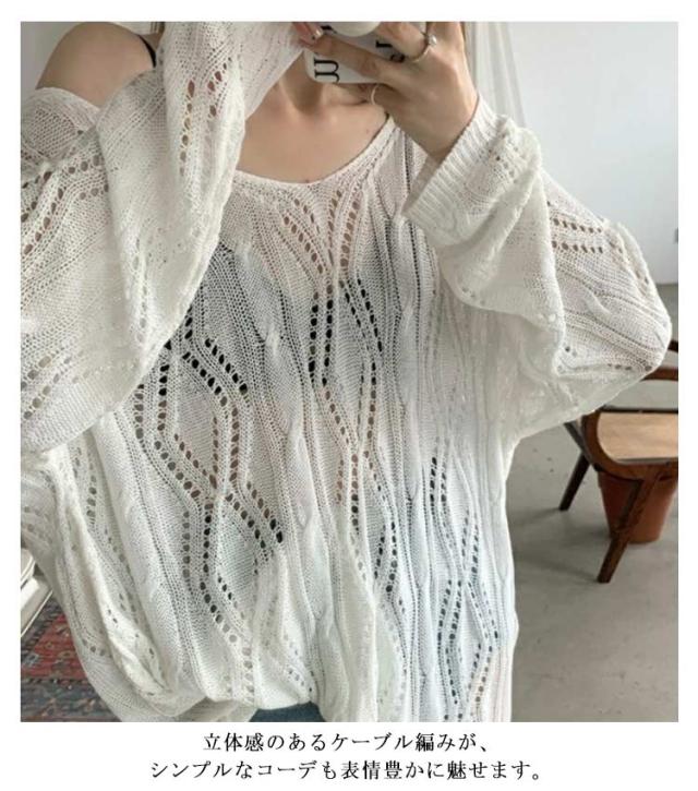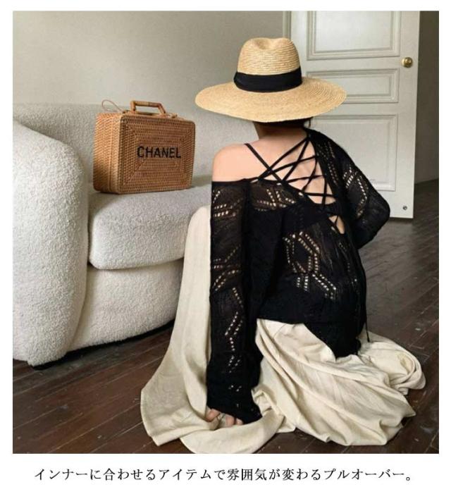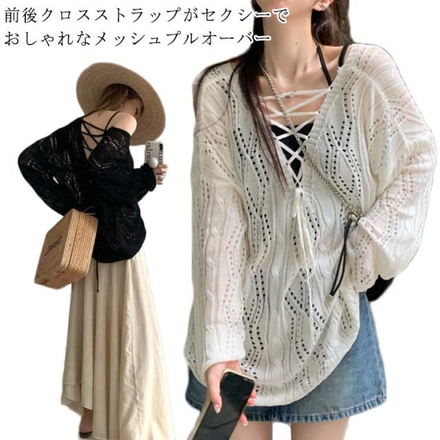 メッシュニット クロス ストラップ 透かし編み ボートネック メッシュ ニット レディース 長袖 トップス プルオーバー ロング ゆったり ニットプルオーバー ケーブル ざっくり レイヤード 重ね着 ボリューム袖 ボリュームスリーブ