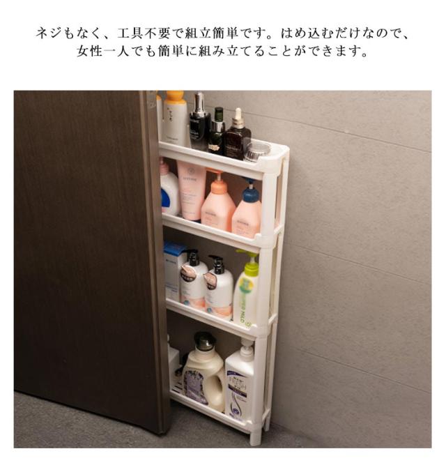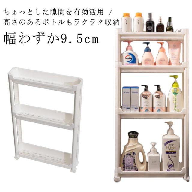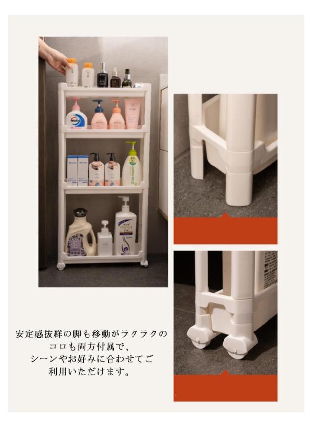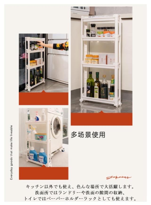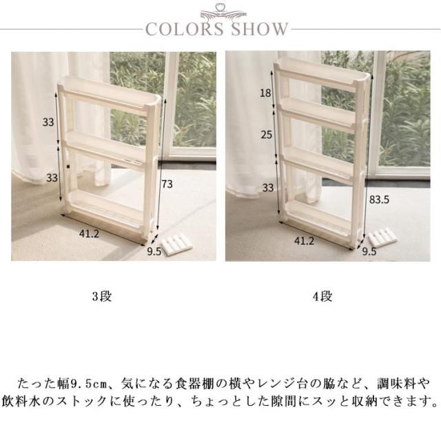 | 幅わずか9.5cm ちょっとした隙間を有効活用 / 高さのあるボトルもラクラク収納 各段の高さが異なるので、いろんなものを収納しやすい。スペースを一番有効活用できます。 たった幅9.5cm、気になる食器棚の横やレンジ台の脇など、調味料や飲料水のストックに使ったり、ちょっとした隙間にスッと収納できます。 キッチン以外でも使え、色んな場所で大活躍します。洗面所ではランドリーや洗面の隙間の収納、トイレではペーパーホルダーラックとしても使えます。 ランドリーにあるわずかなデットスペースに洗剤やシャンプー、石けんをストックできるスペースがつくれるワゴンです。 プラスチック製で棚板に穴あき仕様で、濡れても水がたまらないから、お掃除も簡単です。 ネジもなく、工具不要で組立簡単です。はめ込むだけなので、女性一人でも簡単に組み立てることができます。 安定感抜群の脚も移動がラクラクのコロも両方付属で、シーンやお好みに合わせてご利用いただけます。 | |