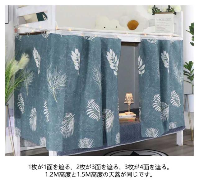 | 二段ベッド用 間仕切りカーテン。繰り返す利用可能の学生寝室ベッドカーテンです。 1枚が1面を遮る、2枚が3面を遮る、3枚が4面を遮る。1.2m高度と1.5m高度の天蓋が同じです。 ※ お薦め:下段ベッド:2枚のカーテン 上段ベッド:2枚カーテン+天蓋 厚手で遮光性が抜群、快適な睡眠環境を演出してくれます。 取り付け用のひもとフックが付いており、ベッドの四周に掛けるだけでいいです。 | |