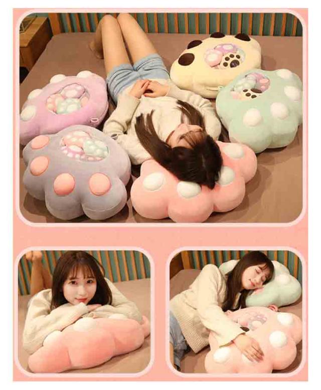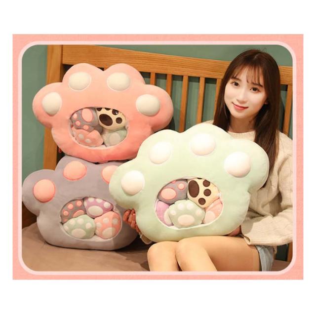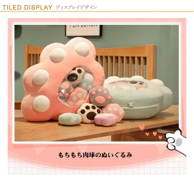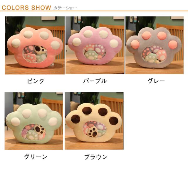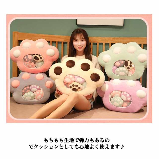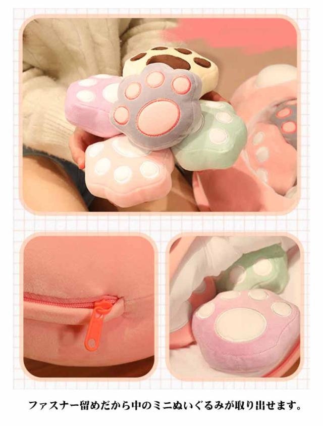 | 5つのミニ肉球のぬいぐるみがついてる!もちもち肉球のぬいぐるみ もちもち生地で弾力もあるのでクッションとしても心地よく使えます♪ かわいい見た目も癒しポイントです。 ファスナー留めだから中のミニぬいぐるみが取り出せます。 | |