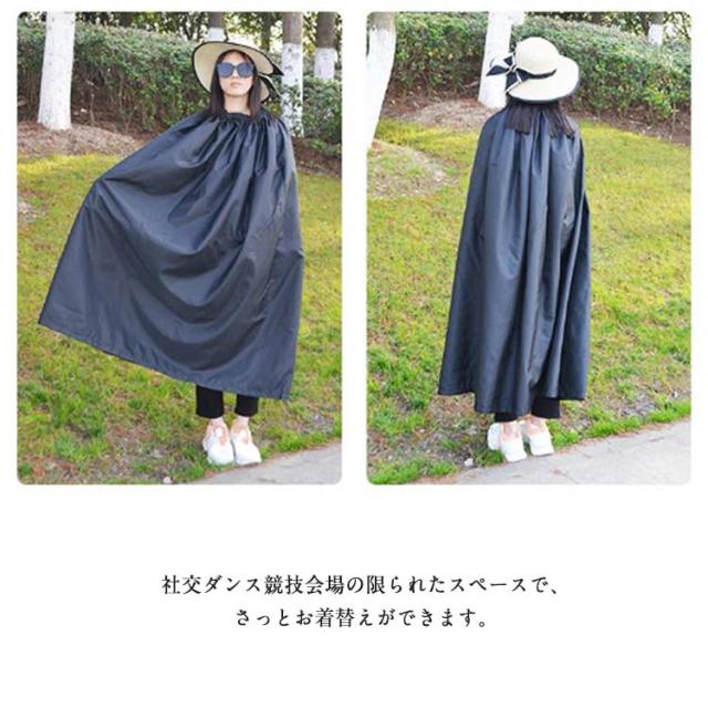 | 収納ポケットが付いたお酒落なお着替え用ケープです! 災害時の簡易更衣室代わりに防災グッツとしても役立ちます。 首元がゴム仕様になっているのと生地面積も広いのですぐに着替えやすい。 男女兼用タイプで、お子様から大人まで使用可能です。 社交ダンス競技会場の限られたスペースで、さっとお着替えができます。 | |