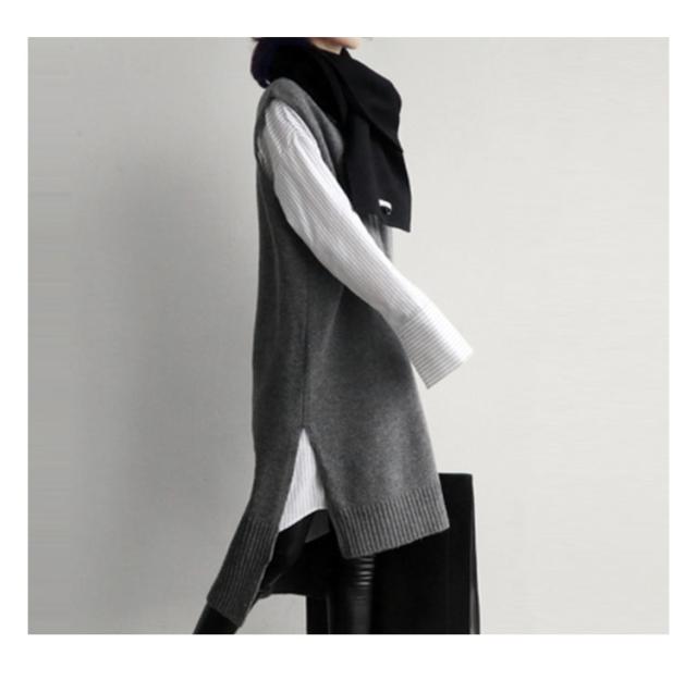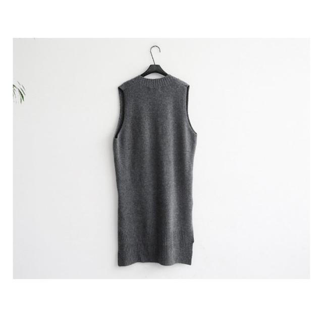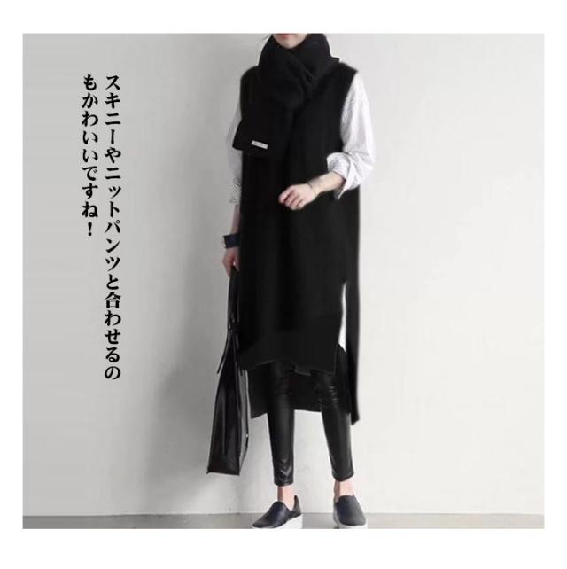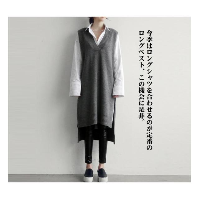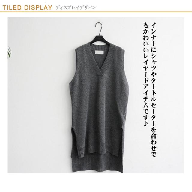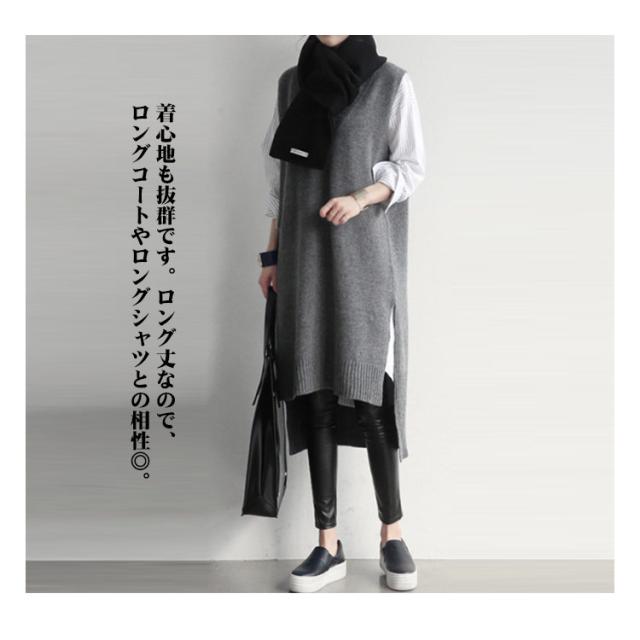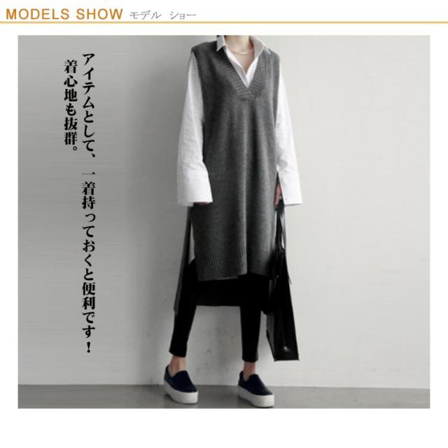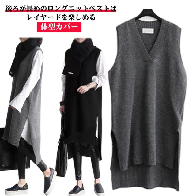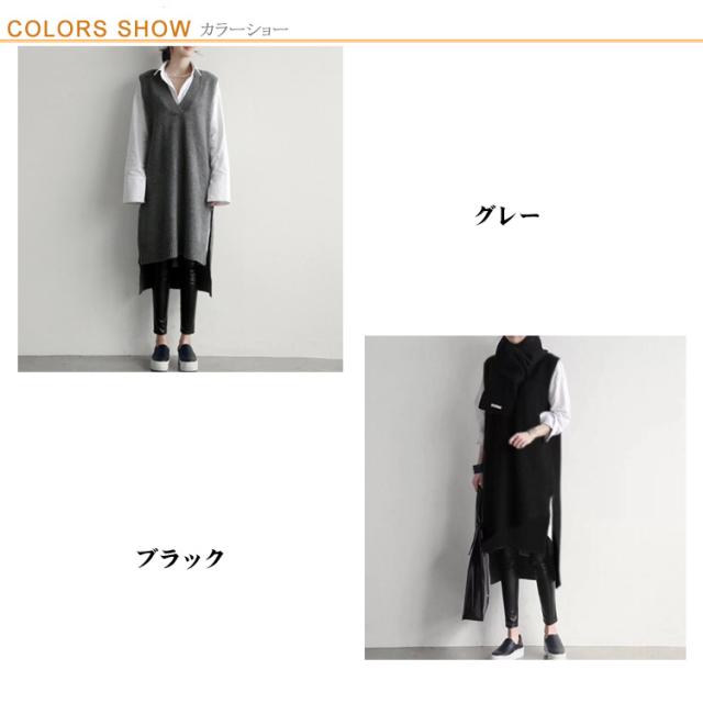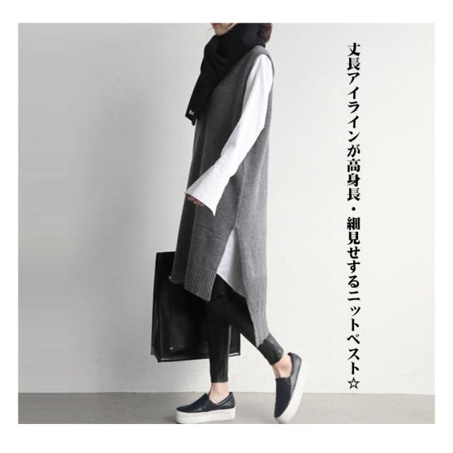 ベスト ロングベスト ワンピース レディース Vネック ロング丈 プルオーバー ニットベスト 前後差 ノースリーブ サイドスリット 無地 体型カバー 秋冬 春 大人 おしゃれ 通勤 20代 30代 40代 50代