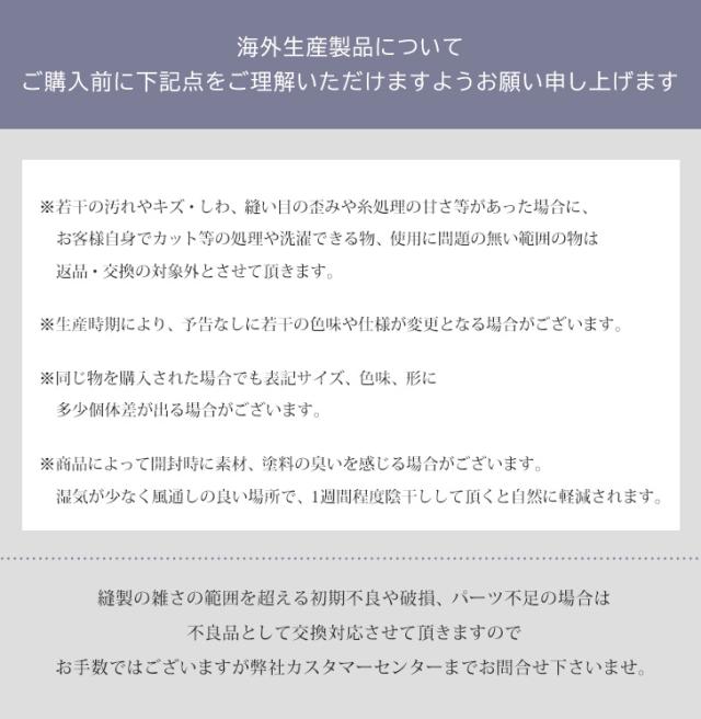 ■注意事項1:商品の開封時に素材の臭いを感じる場合がございます。湿気が少なく風通しの良い場所で、一週間程度陰干しして頂くと自然に軽減されます。