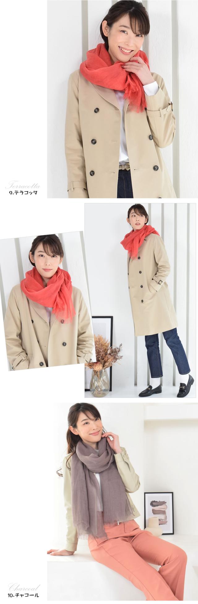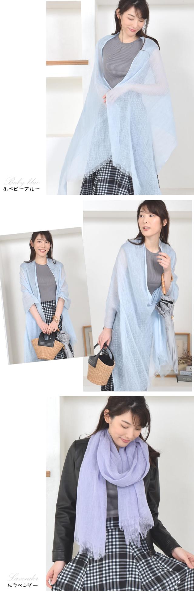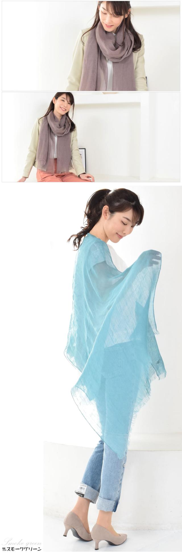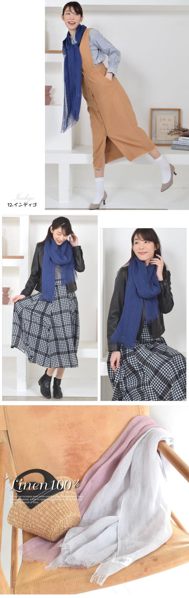 リネンは最初少し固くハリのある質感ですが使っていくほどに肌に馴染み、長く使うほどに肌にスッと寄り添ってくれるストールです。繊維と繊維の間に空気が含まれているため、寒い冬は体温で暖まった空気が体を暖かく包み込み、汗ばむ季節は上手に水分を逃がしサラッとした肌触りで過ごすことができます。大判で日除けや室内の冷房対策にも使いやすく、首元に巻くだけでなく羽織りでも活躍。通気性と保温をバランス良く保ち、一年中快適に使うことができます。
