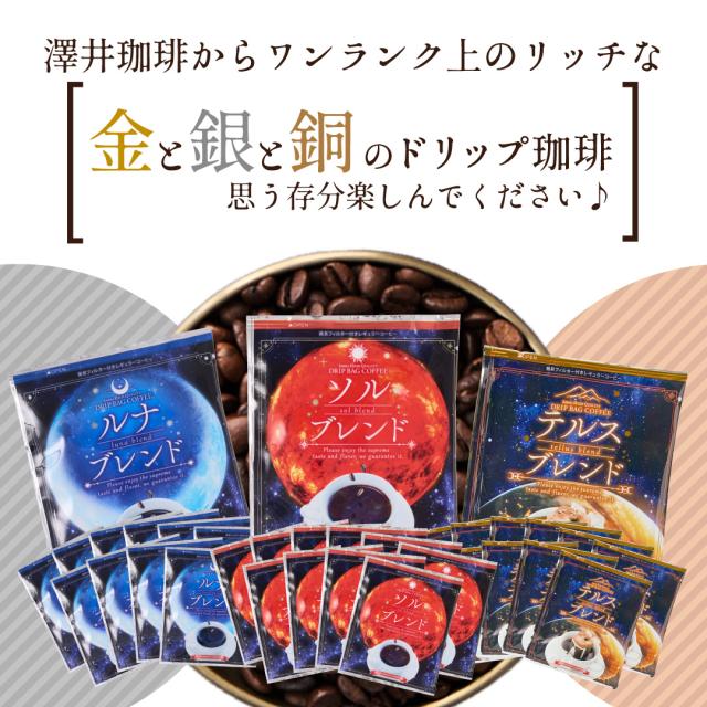 鮮度抜群ドリップコーヒー 60杯 珈琲 ドリップパック 送料無料 コーヒー ドリップバッグ 福袋 大容量 飲み比べ 3種 8gx60袋 個包装 8g セット ブレンド 金と銀と銅の3種60杯分福袋 ソル ルナ テルス プレミアム 贅沢 高級