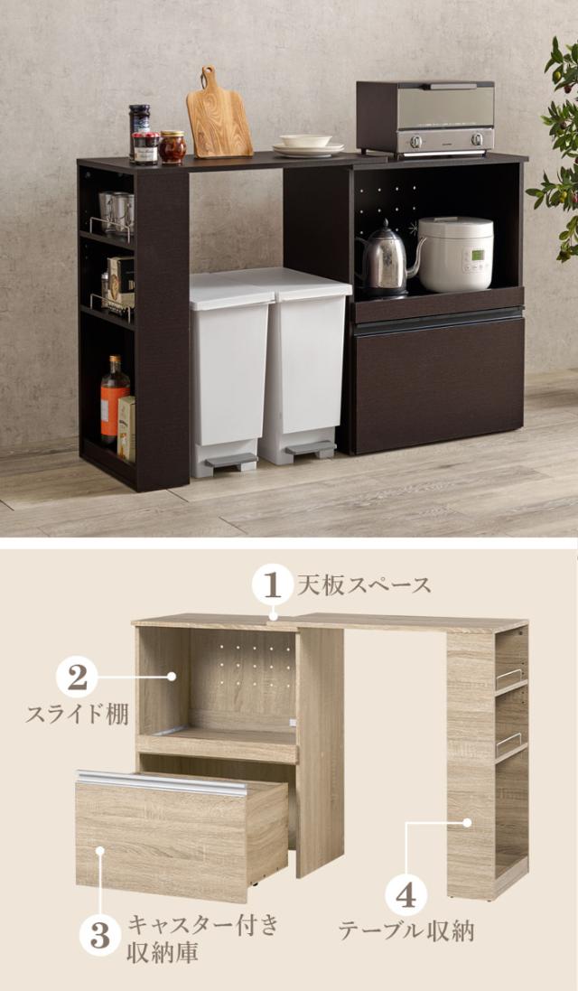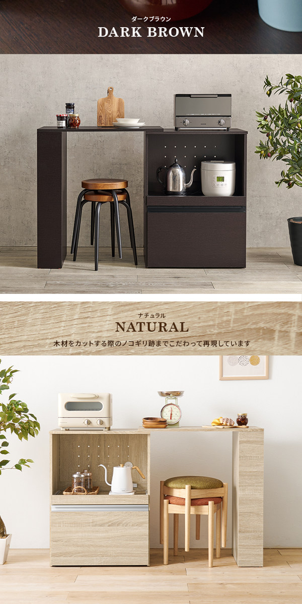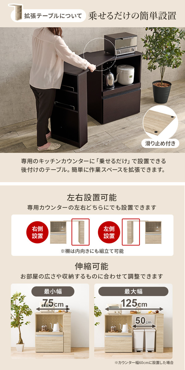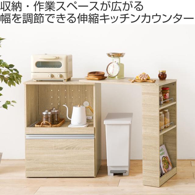 伸縮式 キッチンカウンター 幅75-125cm 収納庫タイプ キャビネット ( 伸縮 カウンター 収納 キッチン 棚 ラック 家電収納 省スペース コンセント付 引き出し ダークブラウン ナチュラル ホワイト )