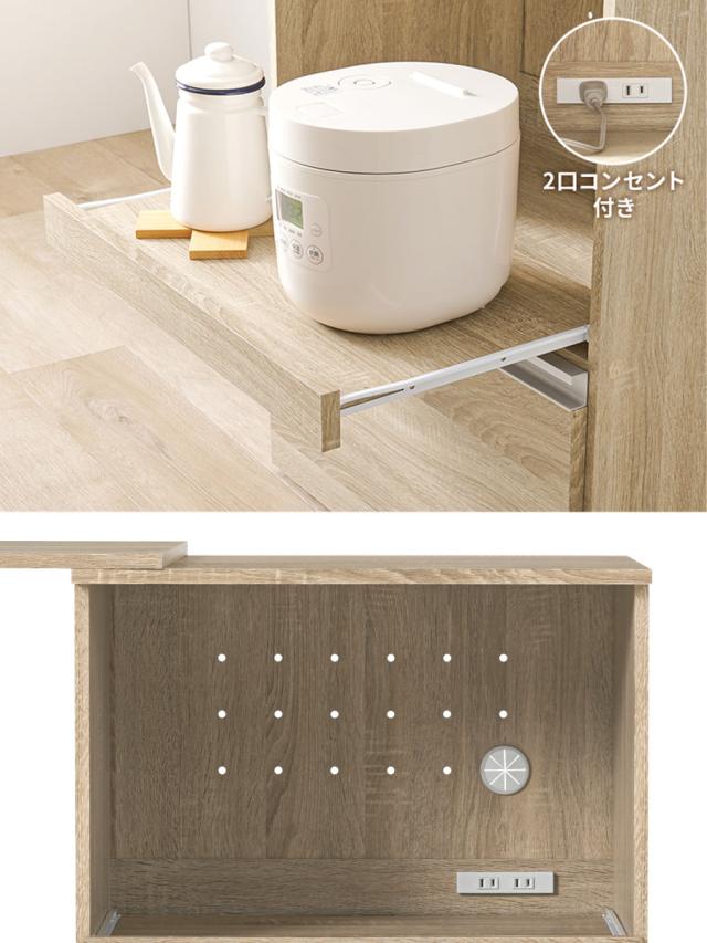 炊飯器や電気ケトルなどを置けるスライド棚。スライドレール仕様なので、家電を置いてもスムーズに出し入れができます。後方には2口コンセントと、熱気を逃がす通気穴、配線に便利なコード穴付きです。