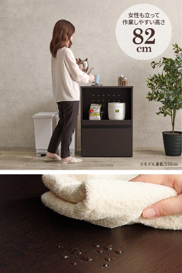 天板とスライド棚には水や汚れに強いPVCを採用しています。万が一汚れてしまっても、サッと拭きとれてお手入れが楽ちん。耐久性が高いので安心してお使いいただけます。立って作業しやすい高さ82cmで、家事や作業の際にもストレスゼロです。