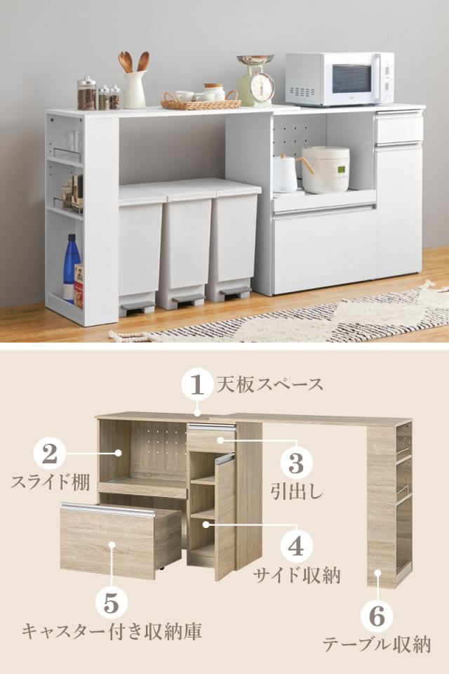 スペースに合わせて幅を調節できる伸縮キッチンカウンターです。コンパクトでありながら多機能で、食器や調理器具、キッチン家電もスッキリひとまとめに収納することができます。