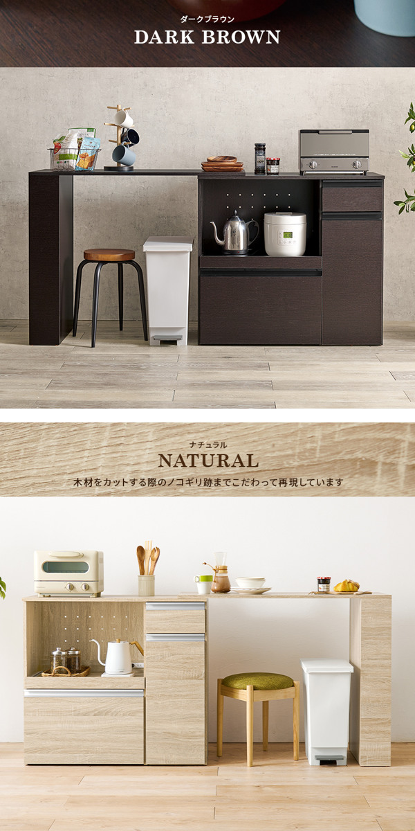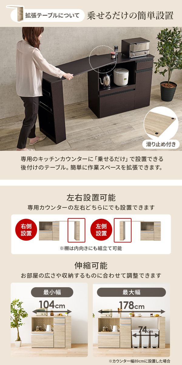 伸縮式 キッチンカウンター 幅104-178cm 収納庫タイプ キャビネット ( 伸縮 カウンター 収納 キッチン 棚 ラック 家電収納 省スペース コンセント付 引き出し 可動棚 ダークブラウン ナチュラル ホワイト )