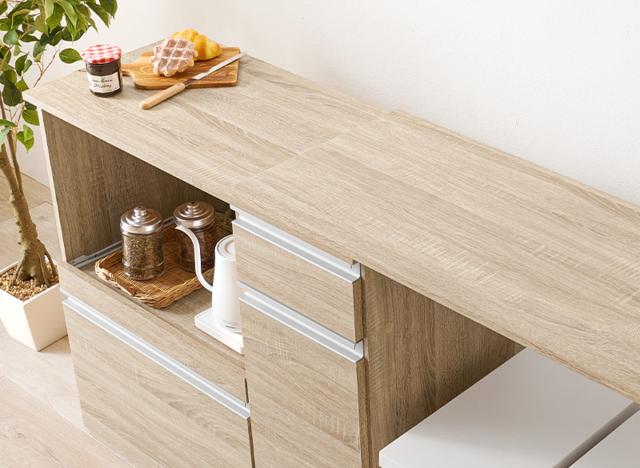 | 材質 | 主材:プリント紙化粧パーティクルボード 天板、スライド棚:合成樹脂化粧パーティクルボード 取手:スチール |
