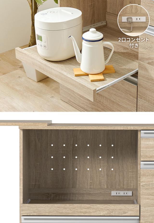 炊飯器や電気ケトルなどを置けるスライド棚。スライドレール仕様なので、家電を置いてもスムーズに出し入れができます。後方には2口コンセントと、熱気を逃がす通気穴、配線に便利なコード穴付きです。