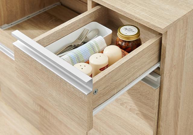 カトラリーや細かい物の収納にぴったりな引出し収納。こちらもスライドレール仕様なので、軽い力で引き出せます。取っ手は、持ちやすくスマートな印象です。