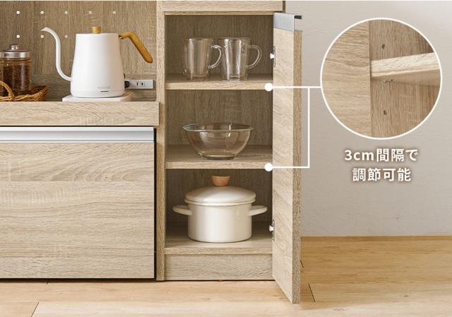 コンパクトな3段の扉収納。棚板を取り外すと高さ56cmで、調味料などの背の高い物も収納できます。