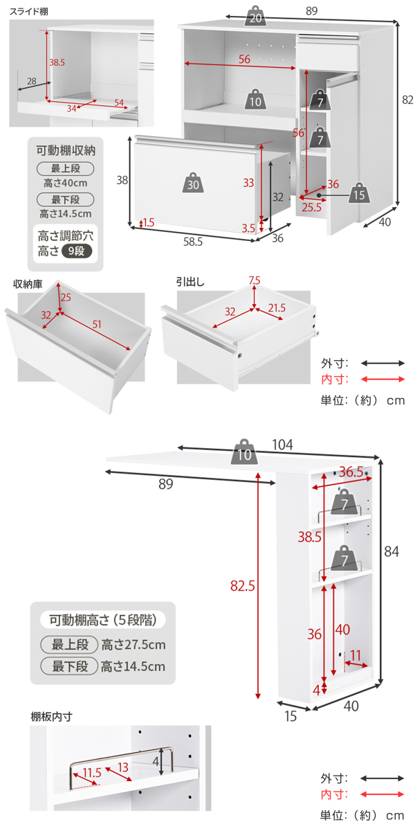 | 耐荷重 | スライド棚:10kg 収納庫:30kg |