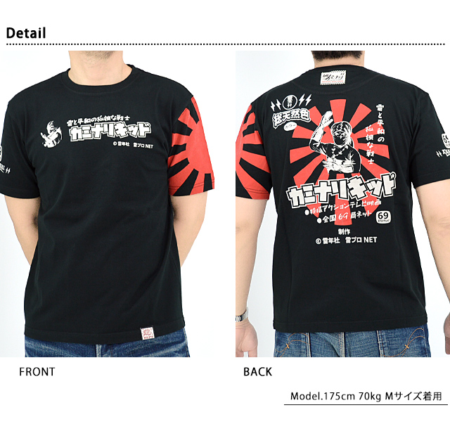「JAPANESE BAD BOY」をコンセプトに掲げ、昭和の由緒正しき不良文化にロックなスパイスを注入したブランド「カミナリ」より「カミナリキッド半袖Tシャツ(KMT-242)」が入荷してまいりました。 雷と平和の孤独な戦士「カミナリキッド」をモチーフにした半袖Tシャツです。 レトロな映画のポスターのような絵柄を背中にダイナミックにプリント。 モノトーンなカラーリングに、背景の赤が鮮やかに映えています。 全国「69(ロック)局ネット」や「制作 雷年社 雷プロ」など、随所に遊び心の詰まったデザインが魅力的。 右袖にはEFUテレビのロゴをデザイン。 生地はストレッチのきいた、さらりとしたものを使用。 | |||||||||||||||||||||||||