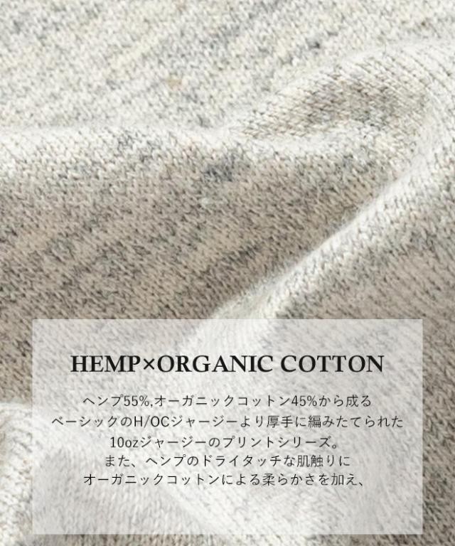 ヘンプ55%,オーガニックコットン45%から成るベーシックのH/OCジャージーより厚手に編みたてられた10ozジャージーのプリントシリーズ。